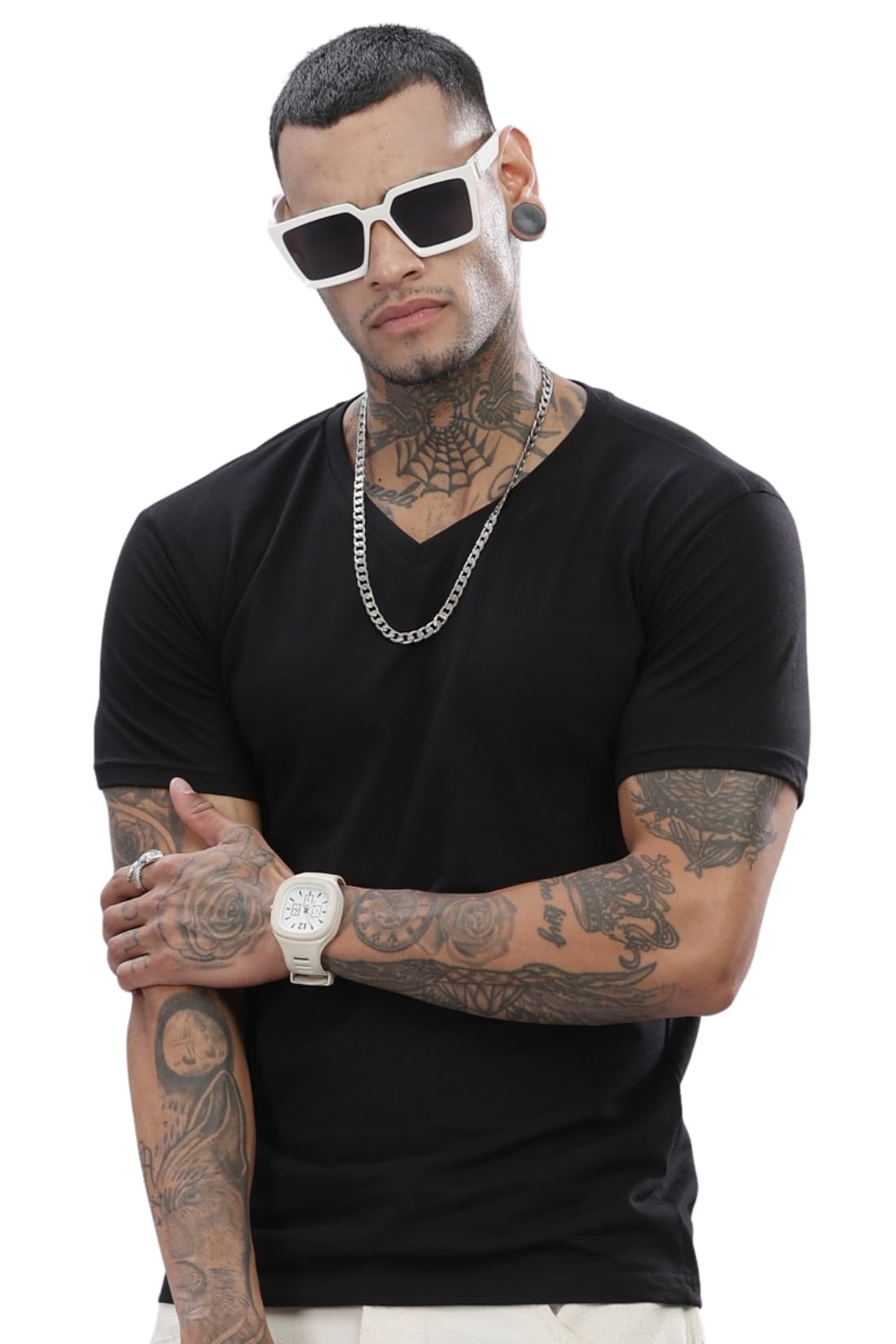 ADRO Men's V Neck Solid Cotton T-Shirt (VN-M-PLN-BL_Black)