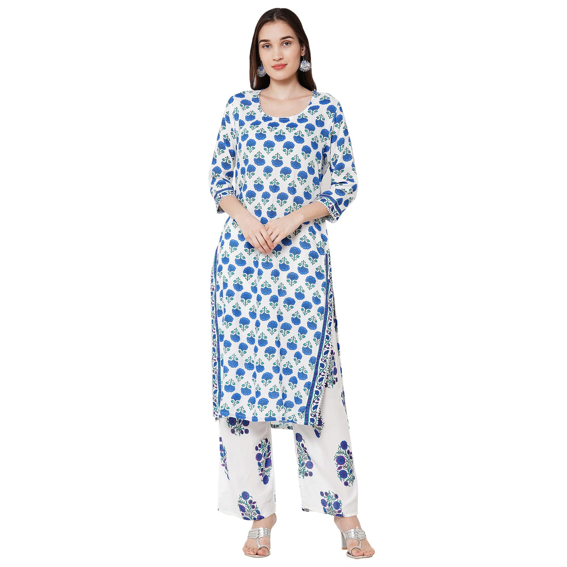 ANNI DESIGNER Women's Rayon Cotton Printed Kurta with Palazzo and Dupatta (JAIPURI BLUE_STYL_S_Blue_Small)