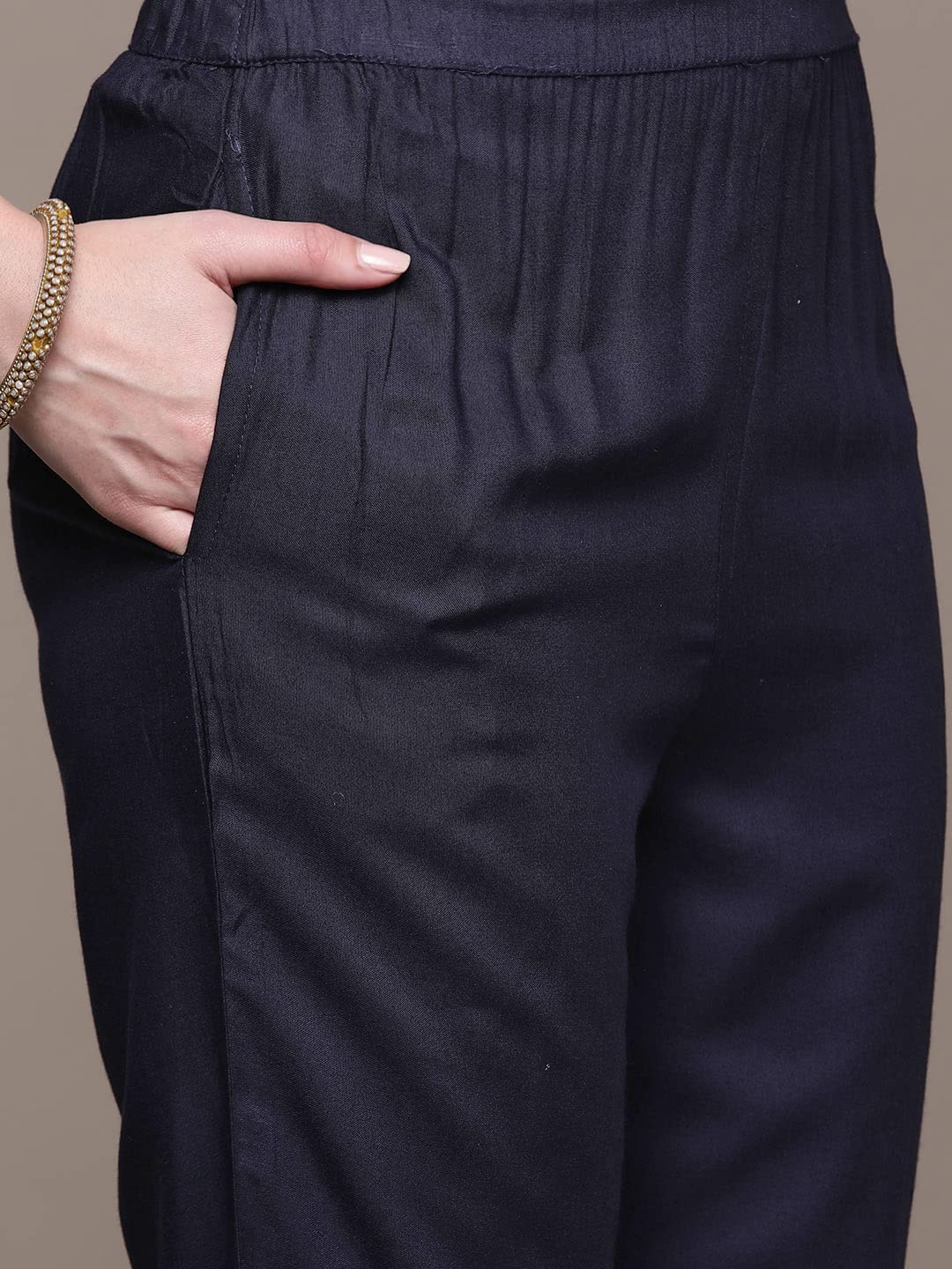 Anubhutee Women's Woven Design Straight Kurta suit set. Bottom-Palazzo, Fabric - Rayon, Color-Navy Blue, Top Length- Calf. Has Tie-Up Neck, 3/4th Sleeves