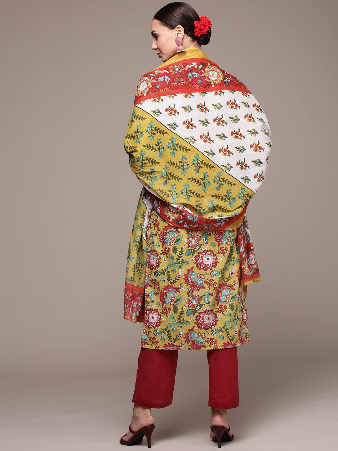 anubhutee Women's Cotton Green Floral Printed Straight Kurta Suit Set With Pants And Dupatta