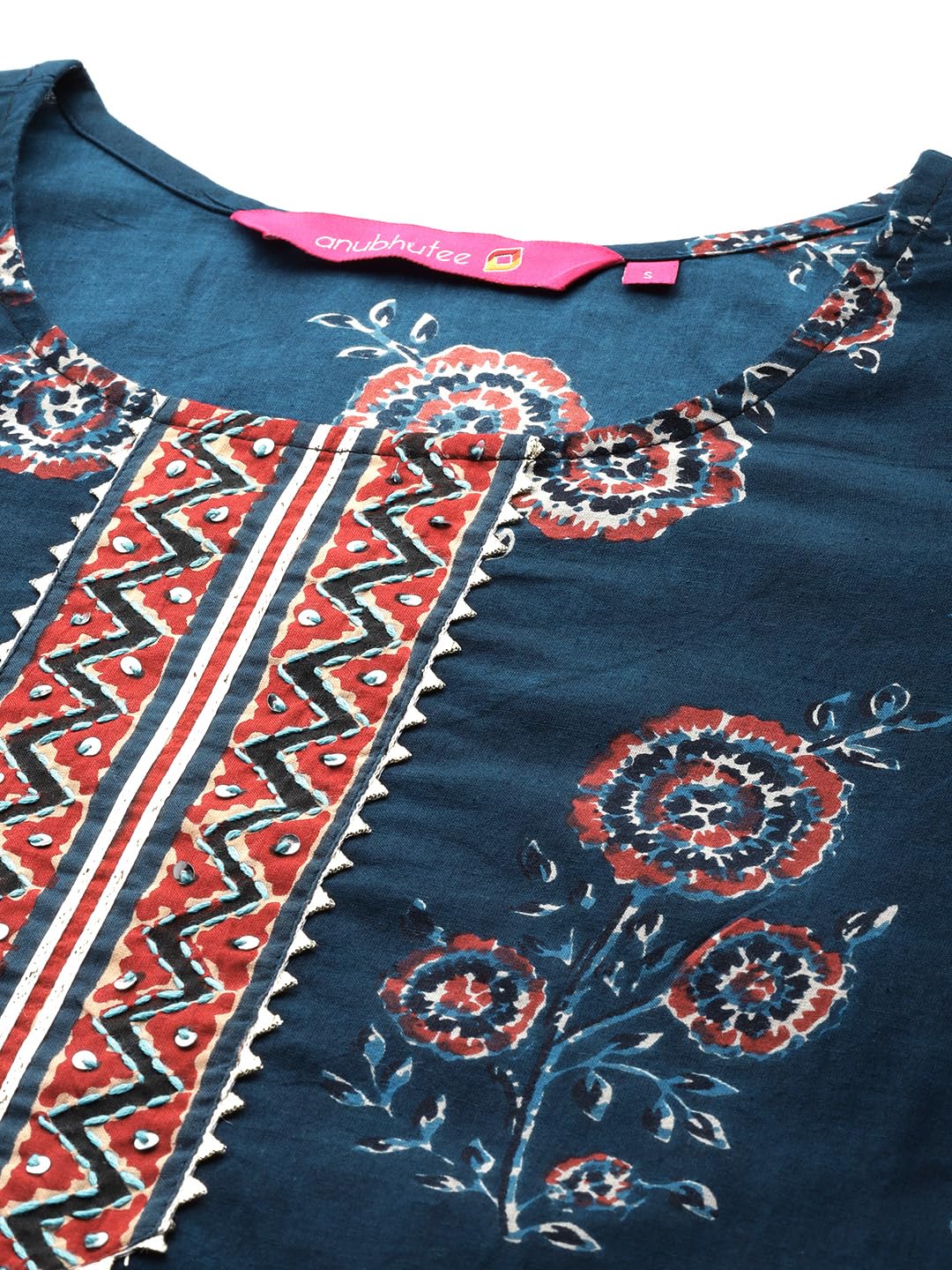 Anubhutee Women's Ethnic Motifs Printed Black A-Line Indo Western Dress- Color- Navy Blue, Fabric- Pure Cotton, Shape- Straight, Pattern- Floral, Has Round Neck, 3/4th Sleeves