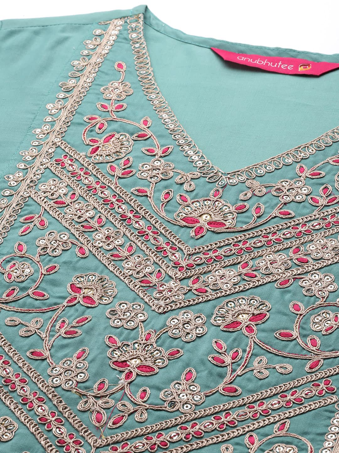 anubhutee Women's Rayon sea Green Ethnic Motifs Embroidered straight Kurta Suit Set With Pants And Dupatta