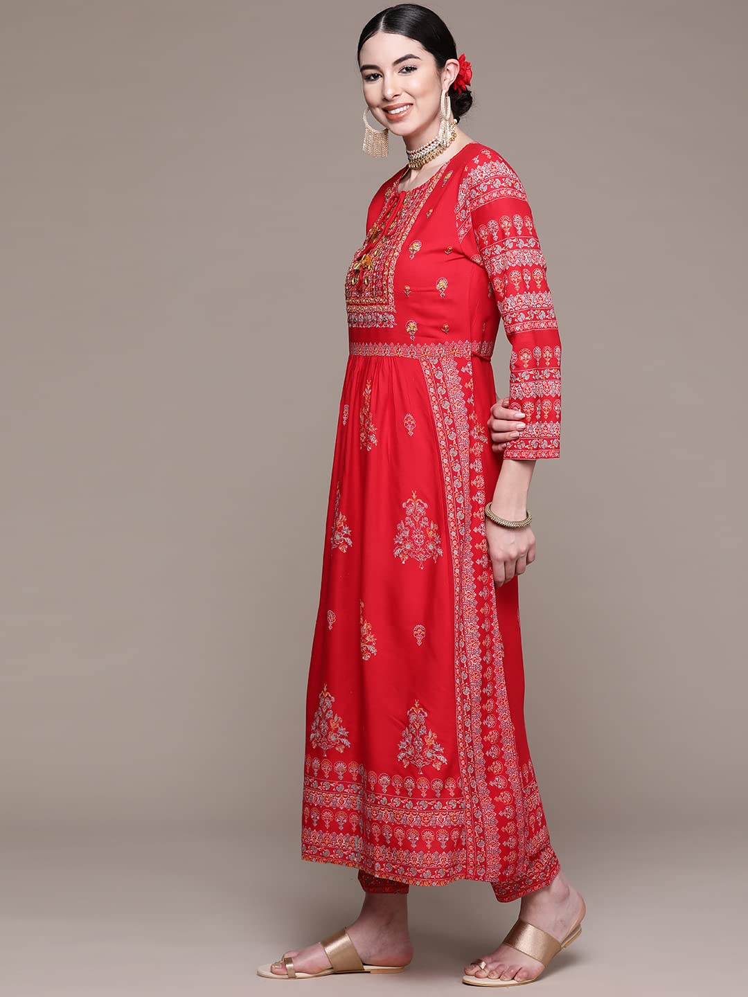 anubhutee Women's Teal Ethnic Motifs Printed Thread Work Rayon Kurta Suit Set with Trousers & Dupatta