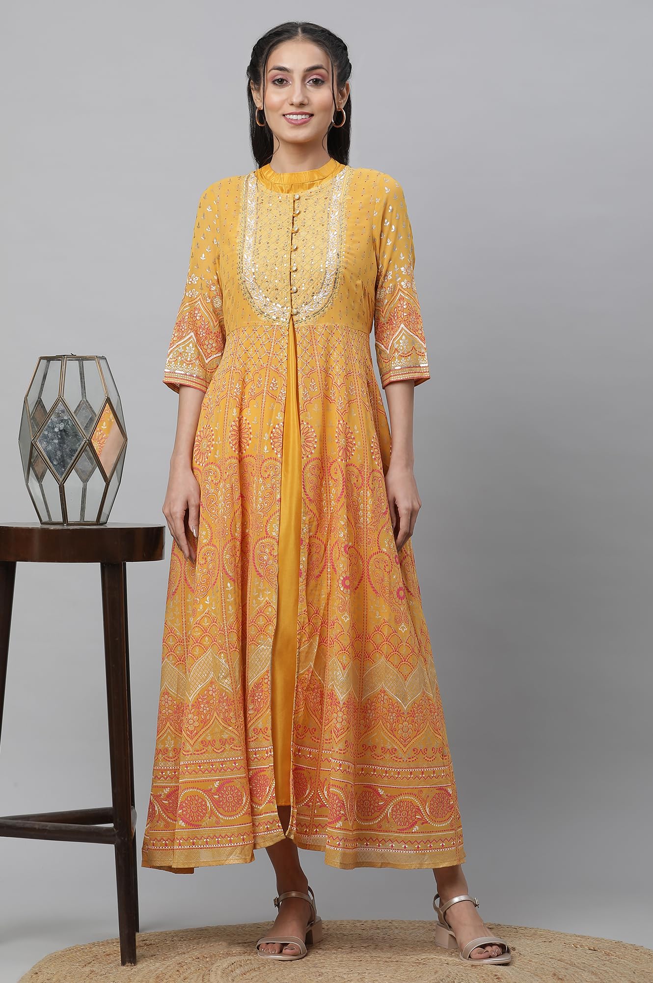 Pink Round Neck Dress Having Three-Fourth Sleeve, And Front Button Placket. It Features Printed And Sequinned Detail With Flared Hem And Also Having Inner.