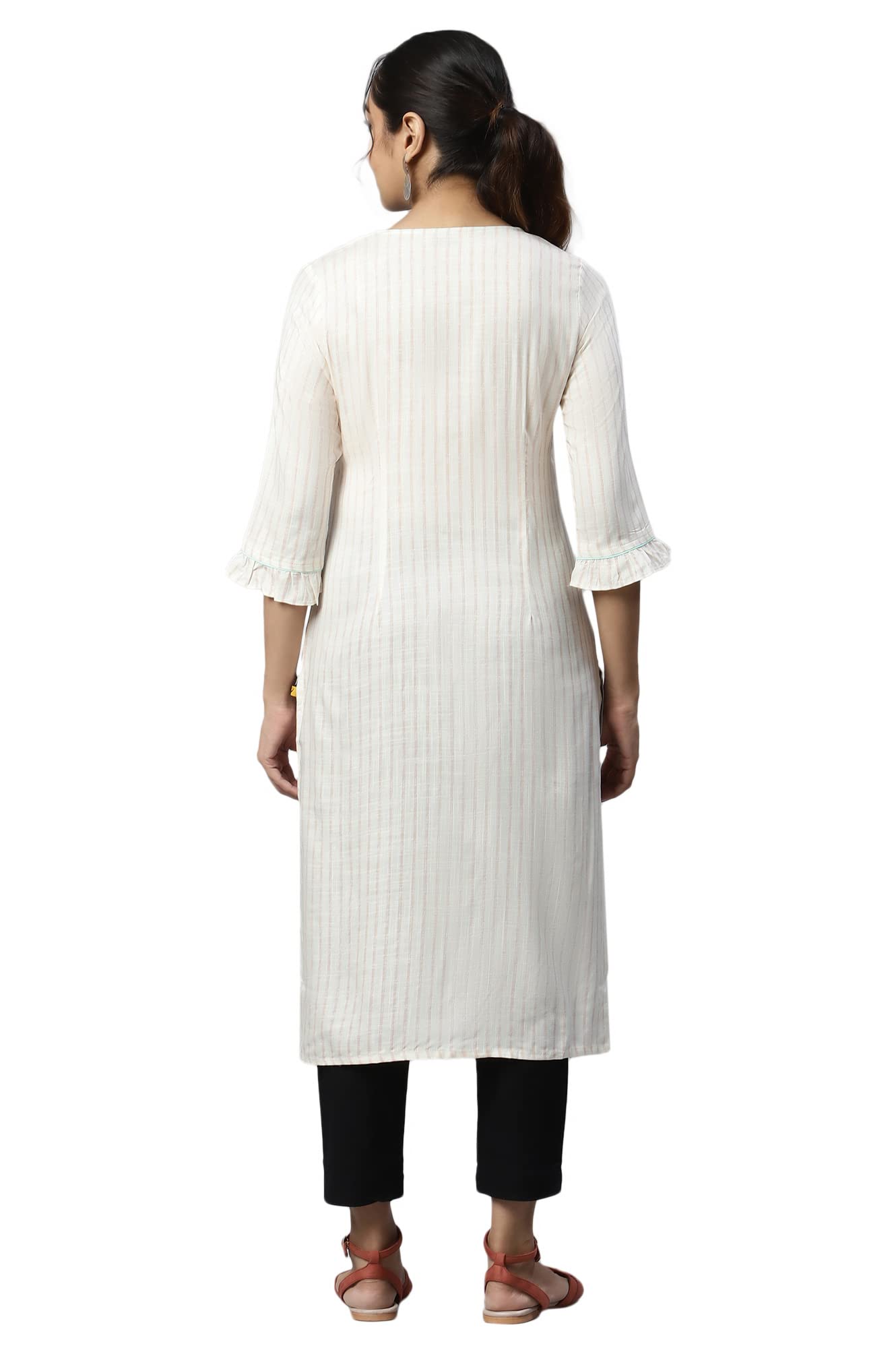 Pop up your wardrobe with this vibrant stripped kurta, adorned with a colourful embroidered collar and complimenting print of floral ombre.