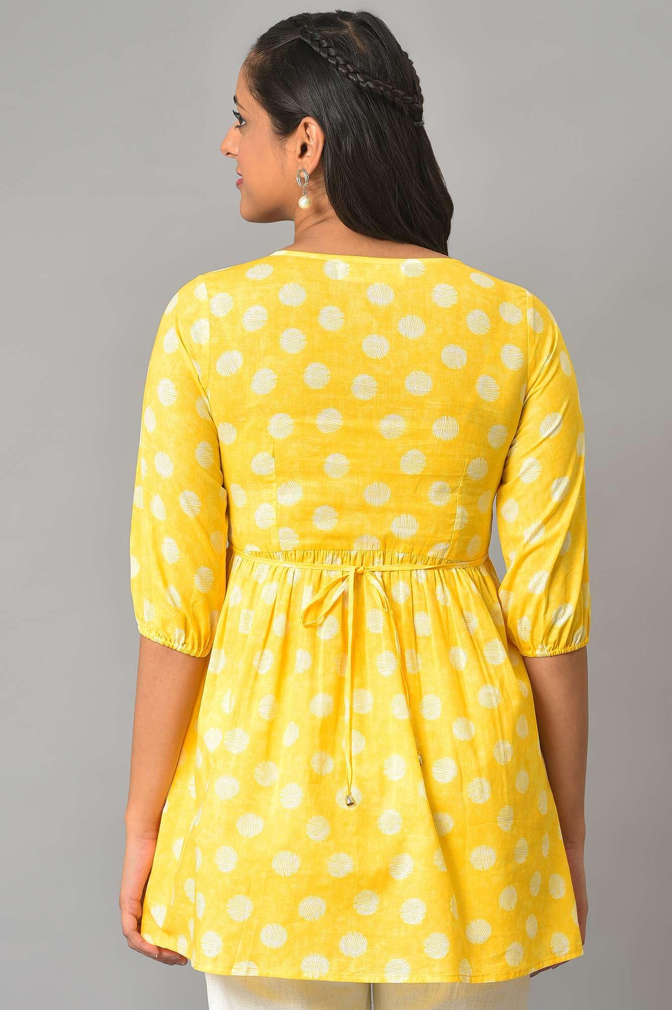 Give Your Everyday Wardrobe A Twist With This Vibrant Aqua Cotton Kurti. It Features A Modern Polka Print With Round Neck, Accentuated With Lace, Button Details And Elasticised 3/4Th Sleeves. Sinch Your Waist With Drawcords To Achieve The Desired Look.