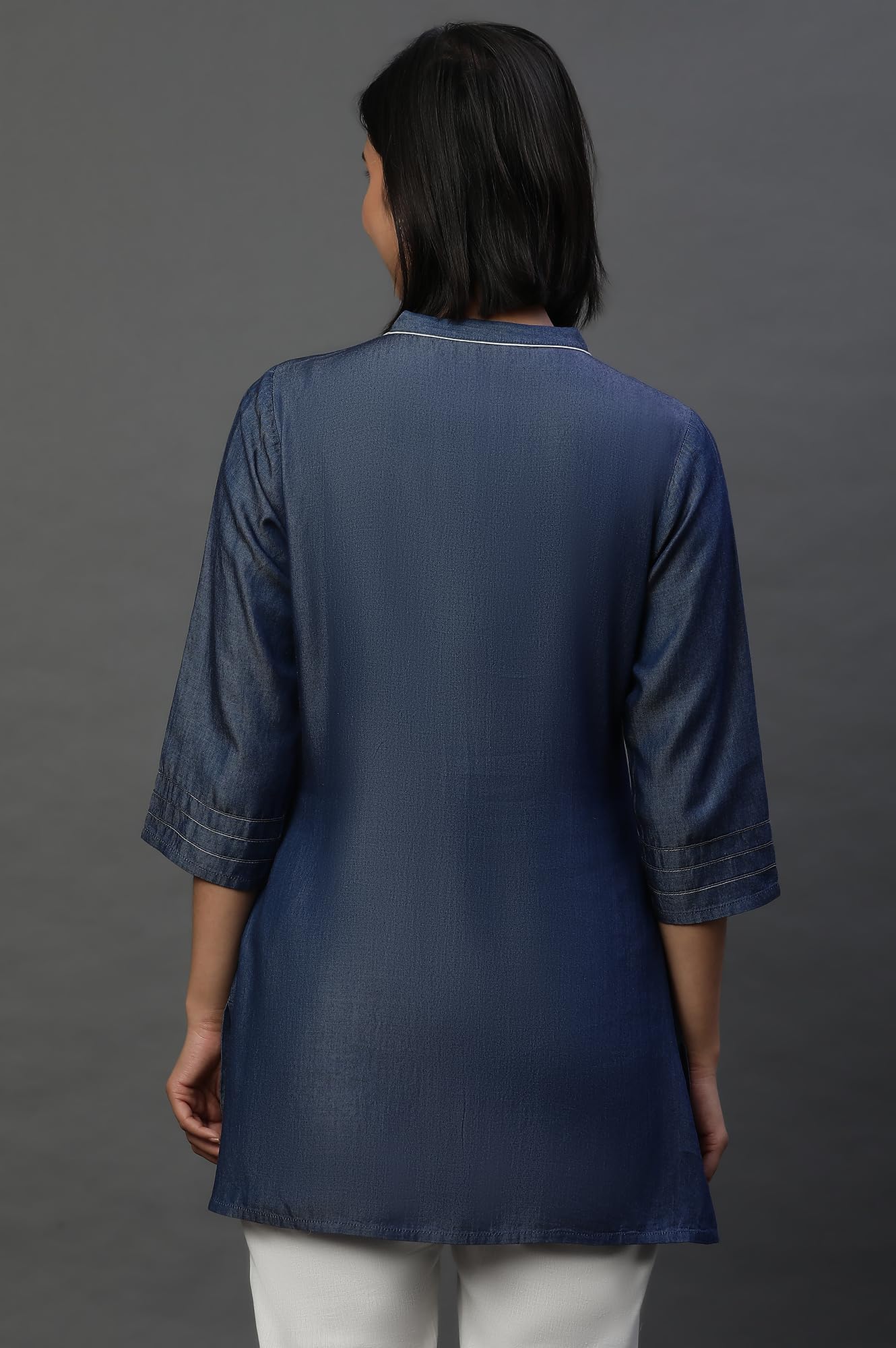 Embrace the timeless elegance of tencil denim fabric. And this spring summer season get styled in our new range short kurti, it has contrasting white stitch line and mandarin collar with half button placket.