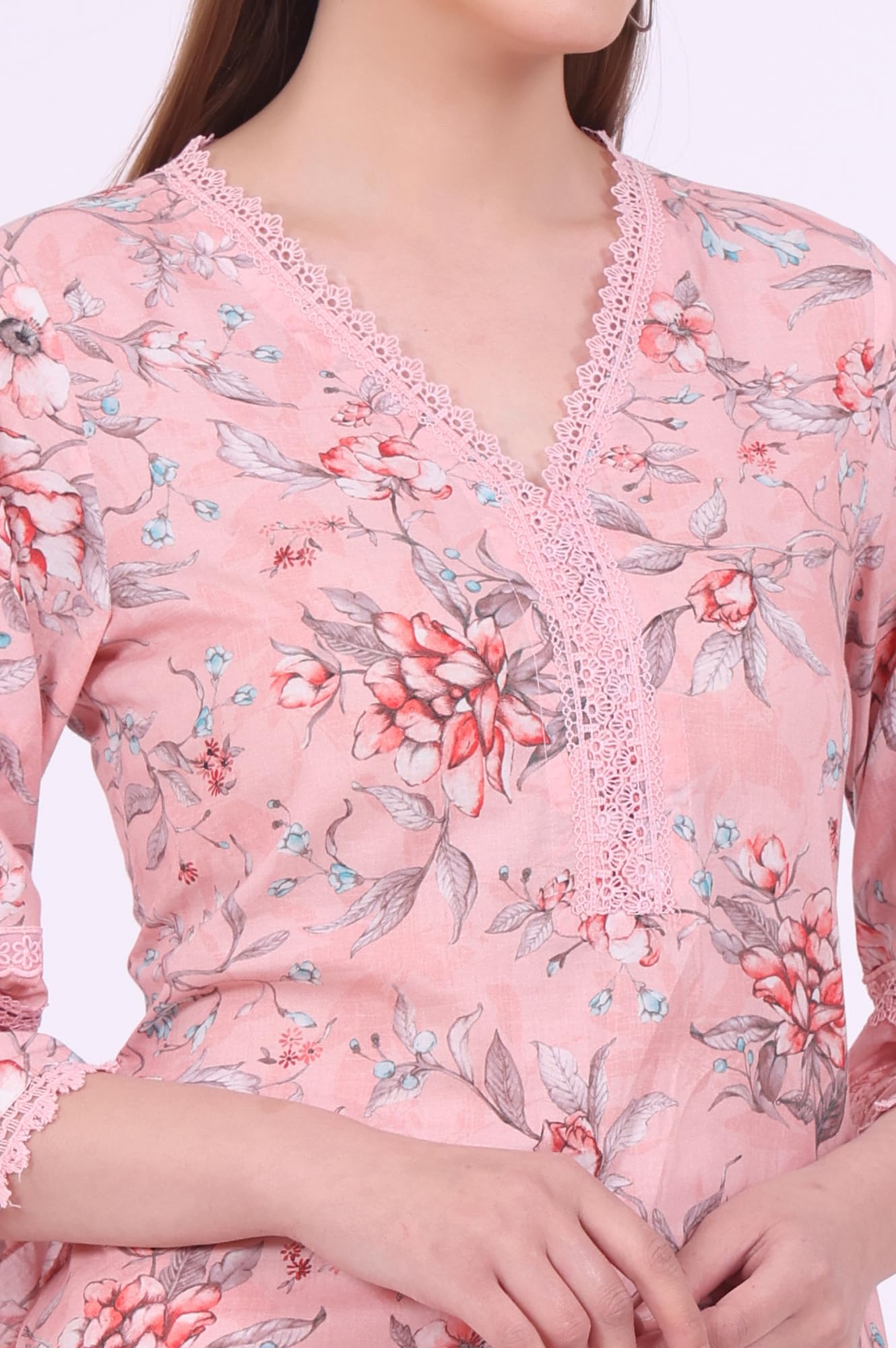Elevate your ethnic wardrobe with this exquisite Aurelia fusion set. The ensemble includes a straight kurta, trousers, and a dupatta, perfect for casual occasions. Crafted from superior 60s cambric, this set offers both comfort and elegance. The dusty rose color adds a soft, feminine touch to your look. The kurta features a v-neck and three-quarter sleeves, adorned with delicate lace details and digital prints. The straight cut of the kurta and trousers creates a sleek silhouette, while the slit detail adds a modern twist. Hand wash recommended to preserve the intricate design. This polyester blend set combines traditional elements with contemporary style, making it a versatile choice for various casual events.