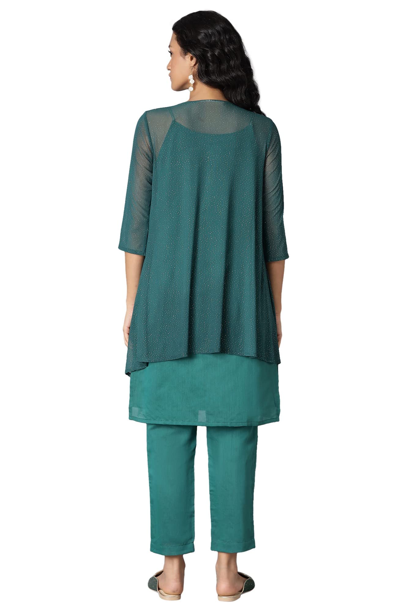 Amp up your modern ethnic styling by wearing this gilet and kurti set. The set includes a front open poly net red gilet having polka dots. It is coordinated with a salsa red kurti in round neck and adorned with sequin work. And to complete the look the set comes with trousers in mid-rise and elasticated waistband.