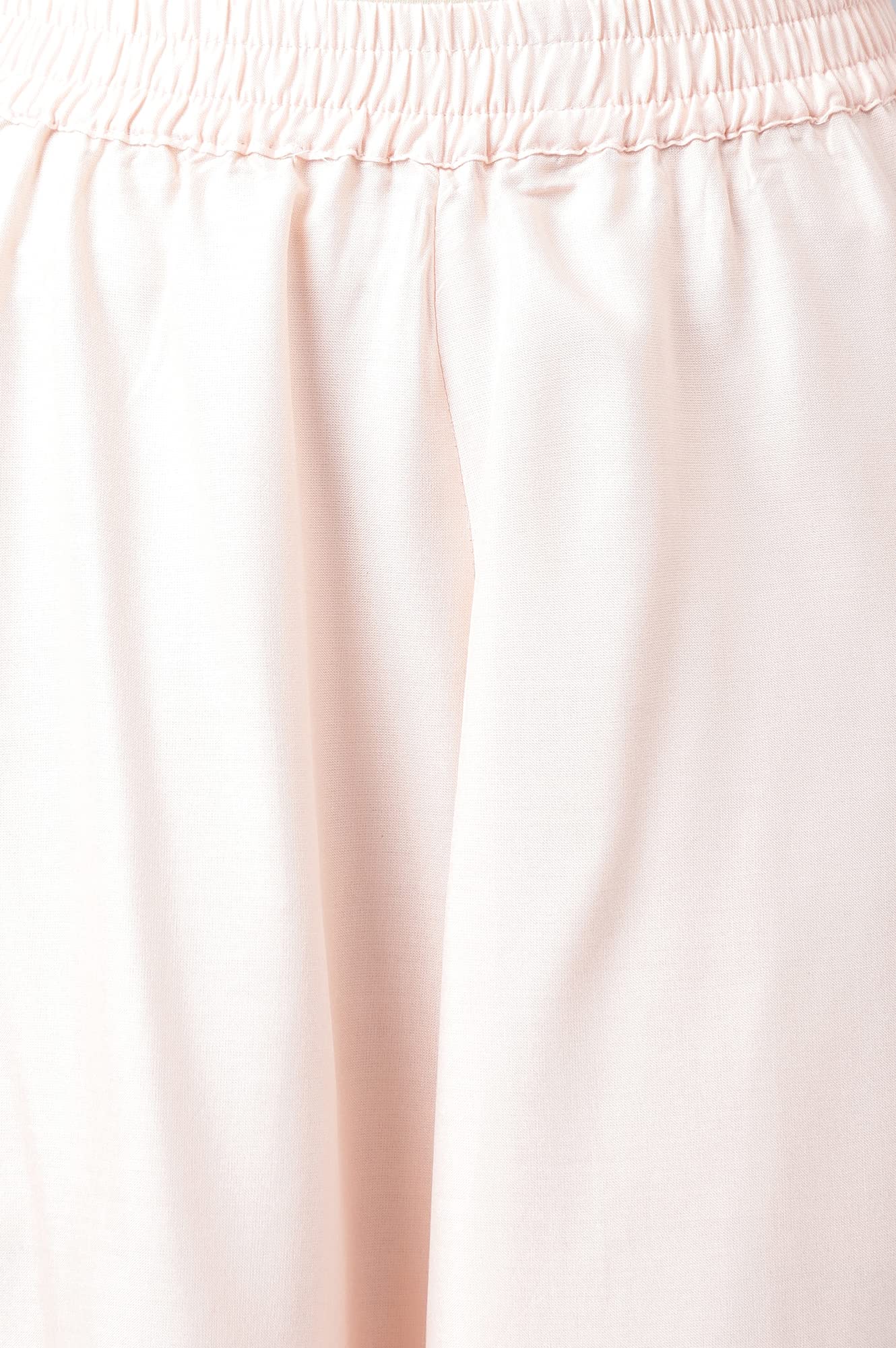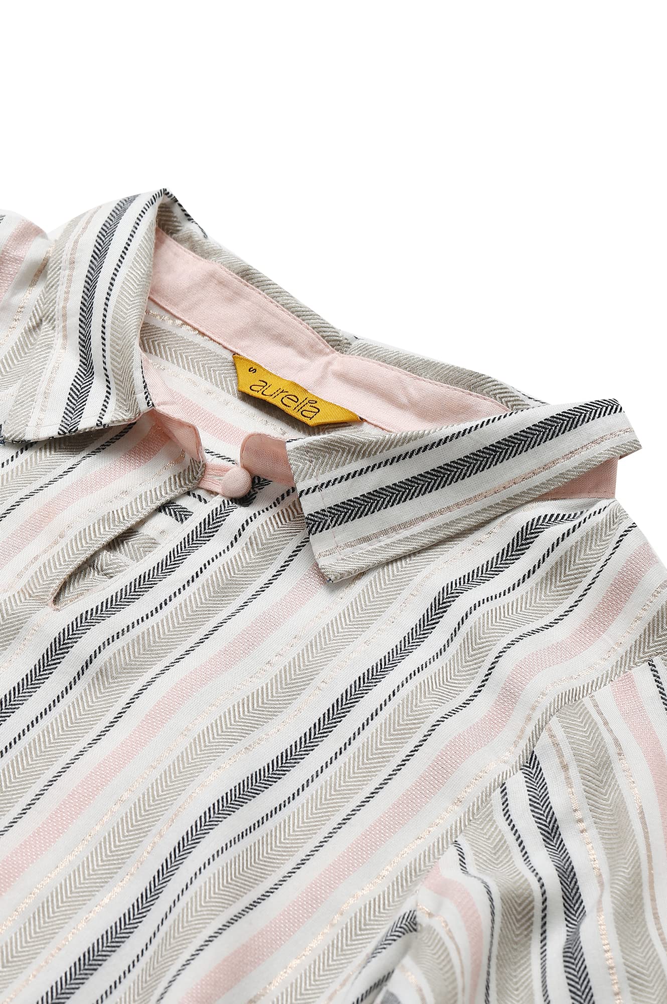 Off-white stripe print kurta in shirt collar, paired with light pink flared culottes. This kurta set gives a smart and ultra-modern look, you can catch a flight or even go on a date wearing this chic outfit.