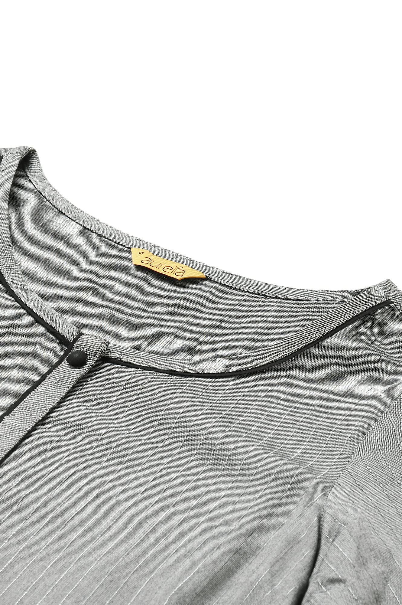 A well-cut kurta is a wardrobe essential and our newest rendition comes in the form of a smart ultra-modern two-piece set. It includes a straight kurta that has a shirt collar, a welt pocket and elbow sleeves with a cuff detail. It is paired with a grey culottes.