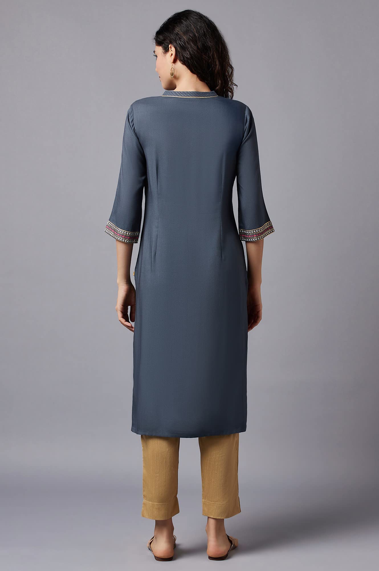 Aurelia Women's Viscose Grey Floral Band Collar Straight Kurta