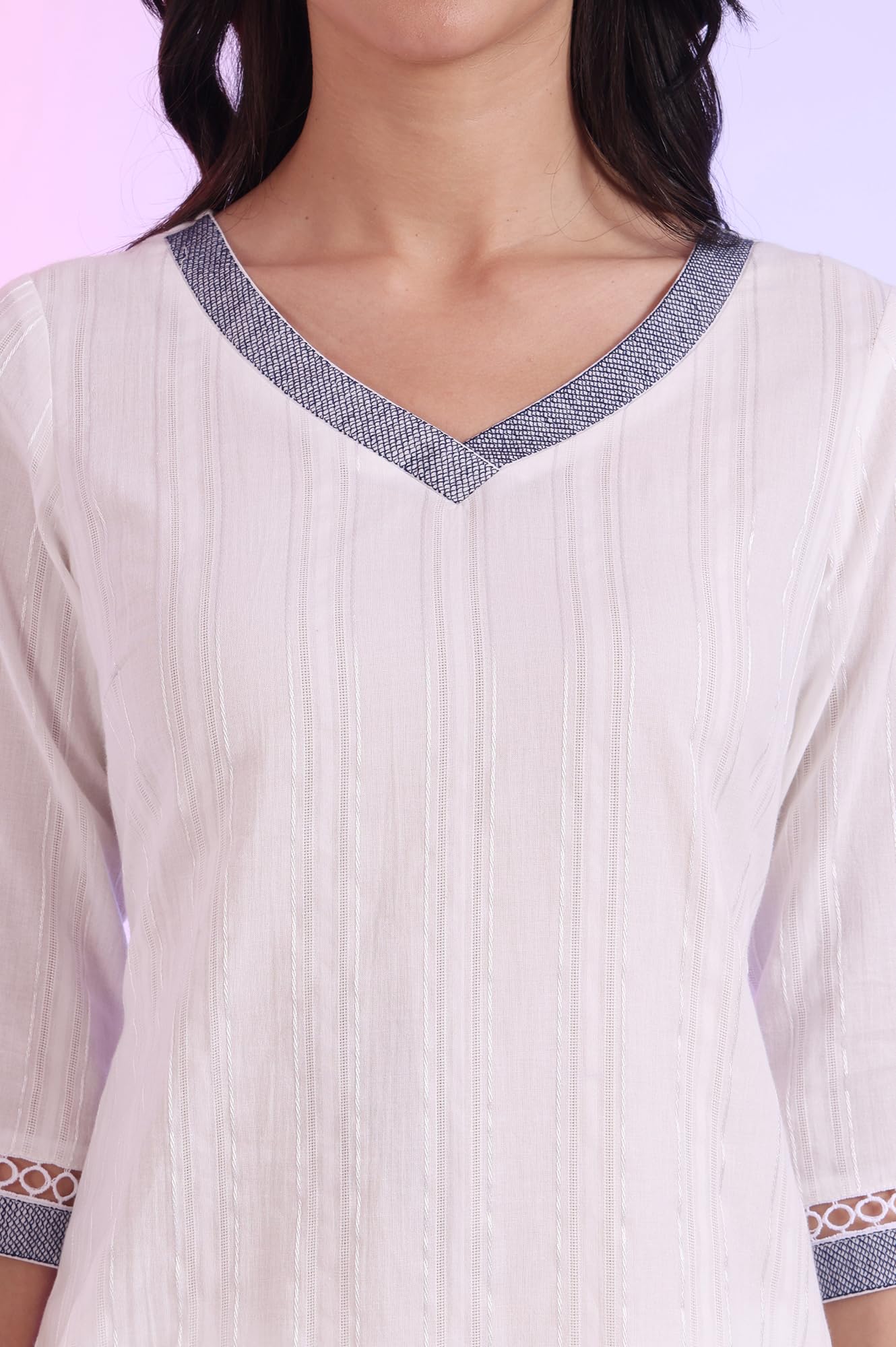 Aurelia brings you a charming fusion kurta that combines style and versatility. This knee-length kurta in pristine white is expertly crafted using the woven construction technique, ensuring a flattering fit and long-lasting quality. Made from a comfortable blend of 95% cotton and 5% polyester, it offers the perfect balance of breathability and durability. The v-neck design adds a touch of femininity, while the three-quarter sleeves provide a classic look suitable for various occasions. The straight silhouette is complemented by a stylish slit detail, making it ideal for casual wear. This kurta is designed for women who appreciate a harmonious blend of traditional and modern elements in their wardrobe. The cotton-blend fabric ensures comfort and ease of movement, making it perfect for everyday use. The addition of elegant thread work elevates the overall design, adding a subtle touch of sophistication. Whether paired with leggings, palazzos, or jeans, this Aurelia kurta is sure to become a versatile staple in your wardrobe, offering both style and comfort for any casual outing.