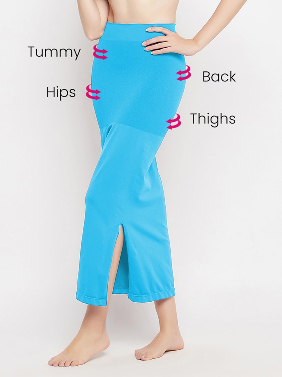 Sky Blue Saree Shapewear. Designed With A Targeted Compression To Smoothen Out And Flatter Your Abdomen, Thighs And Back, Making You Look Slimmer. Featuring A Seamless Waistband That Is Strong Enough To To Hold The Saree Tucks. A Side Slit On The Hemline For An Easy Movement. Unlike Other Available Saree Shapewears, The Slits Are Thoughfully Designed And Do Not Curve Outwards Giving Any Undesirable Perky Shapes At The Bottom. Crafted With 90% Nylon And 10% Spandex To Retain Its Shape. Can Be Worn Instead Of A Petticoat Or Under The Petticoat. Anti Chafing Thigh Band.