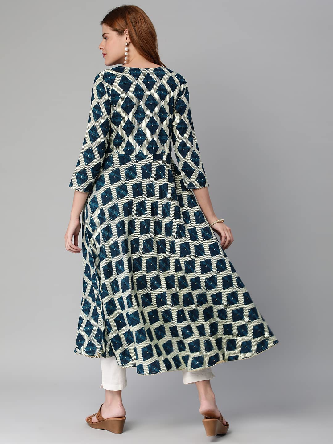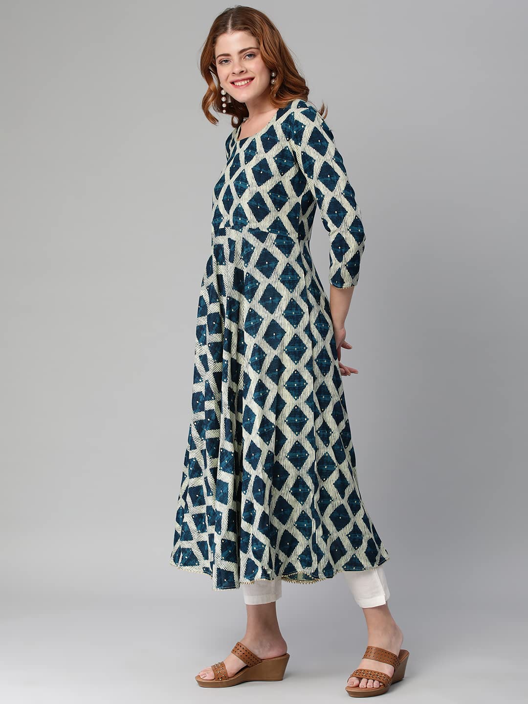 GoSriKi Women's Cotton Blend Chex Printed Anarkali Kurti (Chix Blue-GS)