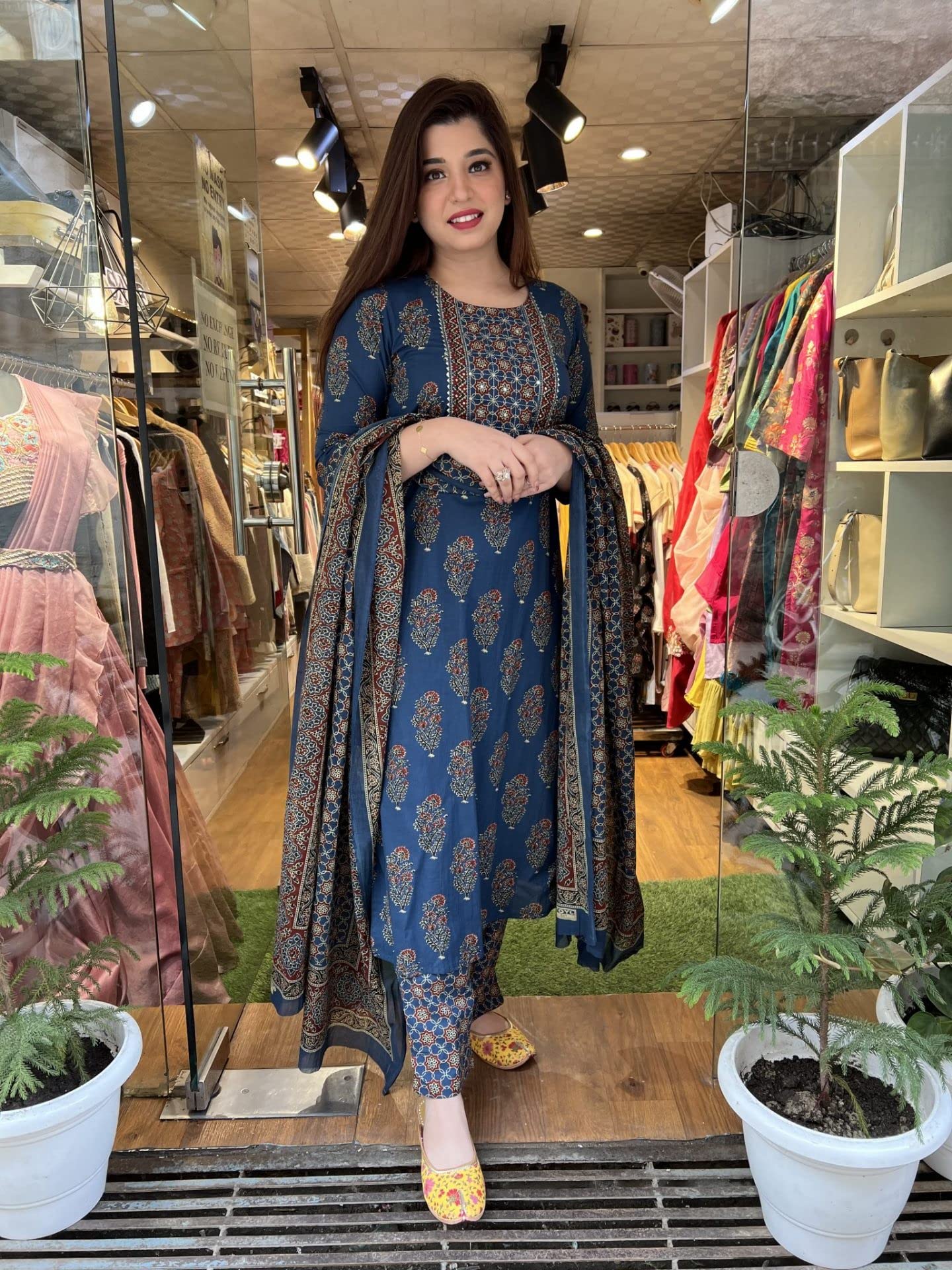 GoSriKi Women's Cotton Blend Straight Printed Kurta with Pant & Dupatta (Patni Blue_3XL-GS_Blue_XXX-Large)