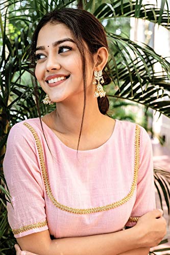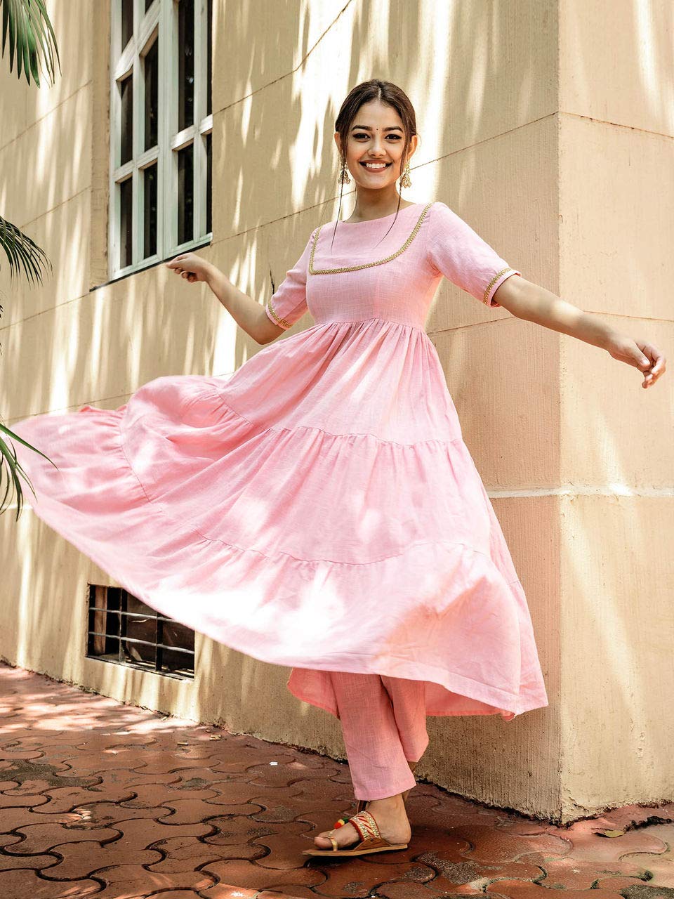 GoSriKi Women's Cotton Anarkali Solid Kurta with Pant (Pink,M)