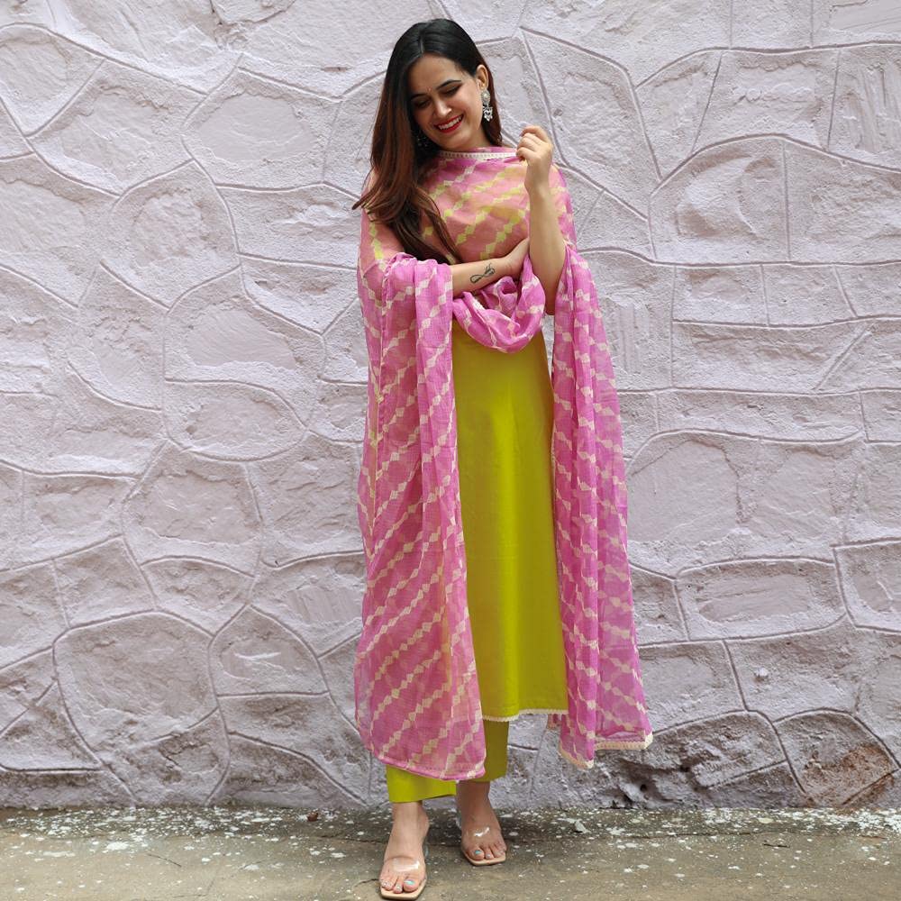 GoSriKi Women's Rayon Solid Kurta with Palazzo and Dupatta (LAHARIYA-PARROT-STY_M_Green_Medium)