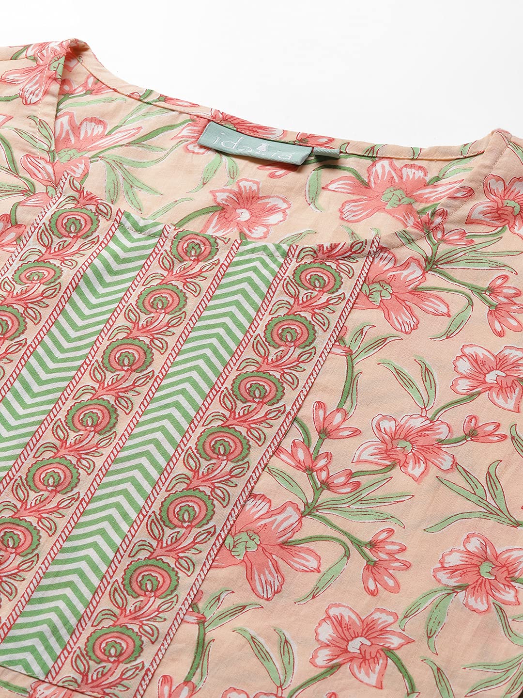Comfort & Breathability This peach and light green printed kurta with palazzo pant and dupatta is great for everyday wear, offering you maximum comfort and breathability all day long. Constructed with lightweight cotton fabric, you'll be able to move and lounge without ever feeling constricted. The breathability of this outfit will be especially useful during the sweltering summer months, allowing you to stay cool and comfortable for the duration of your day. Thanks to the lightweight fabric, you'll be able to enjoy the easy, breezy look and feel of the outfit without ever having to worry about feeling weighed down. Festive Style Make a statement in your ethnic attire with this stylish design that is great for festive and party occasions. The peach and light green printed kurta with printed palazzo pant and dupatta have intricate prints that will make you stand out from the crowd. With the kurta with pant online, you are sure to be a showstopper. The care instructions for this set include machine wash separately, dry clean suggested, don't bleach, tumble dry low, warm iron if needed. Make sure to choose this kurta with pant online for a look that is sure to make heads turn. Versatile Styling Looking for a versatile addition to your wardrobe? Look no further than this women kurta with printed palazzo pant and dupatta. The 3/4th sleeve, round neck, and calf length straight cut kurta in peach and light green printed design is great for any occasion. Whether you are attending a casual outing or a formal event, the outfit can be easily styled in a variety of ways. Create a classic look with statement jewelry or dress it up with a pair of stylish heels. This kurta set with dupatta is sure to become a wardrobe staple and a great way to express your individual style.
