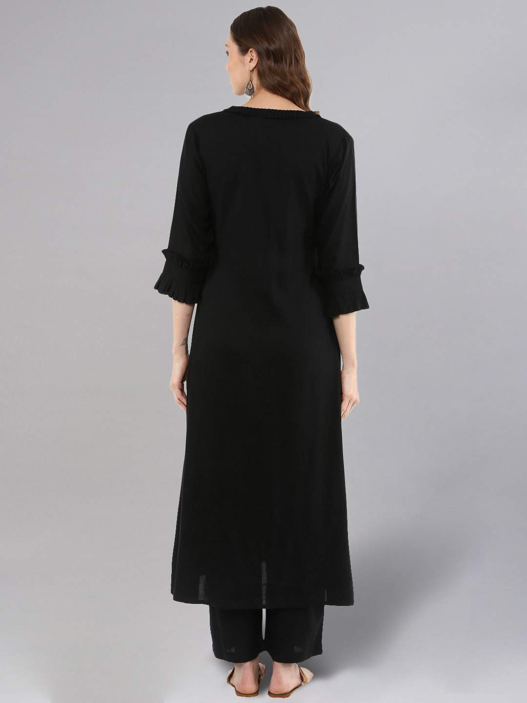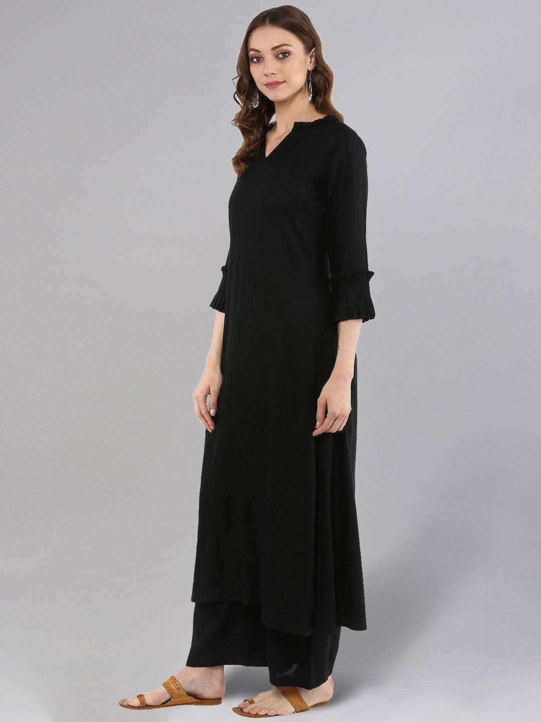 Long-lasting Quality This ethnic kurta set for women is crafted with durable rayon fabric. This ensures superior quality and longevity, allowing the set to stay looking its best for years to come. Whether you want to wear it for special occasions or casual events, this best kurta set online offers reliable style and comfort that will last. Thanks to its durable fabric, you can enjoy this beautiful ethnic kurta set for women with confidence, knowing that it will remain as stunning as the day you bought it. Tailored Fit You'll love the tailored fit of this black rayon a-line kurta with palazzo pant set. It's comfortable and great for formal occasions without having to sacrifice style. It fits your frame just right, giving you an elegant look to make a lasting impression. Whether you're attending a dinner party, an important meeting, or a special event, this set will have you looking your best. The set is easy to care for, with machine washable fabric and a low-tumble dry setting. With its solid black color and fusion wear design, you'll be sure to look sharp. Style Up or Down A good festival kurta set is here! This three-quarter sleeve, v-neck, and calf length kurta palazzo pant set is designed to flatter and keep you stylishly comfortable. But best of all, its versatile design allows you to dress it up or down for a variety of occasions, making it a great choice for any wardrobe. Whether you're looking for something to wear for a family dinner, a day out with friends, or just a casual day at work, this kurta set allows you to easily transition from one look to the other. Get ready to take on any event with this stylish, yet practical, and versatile kurta set.