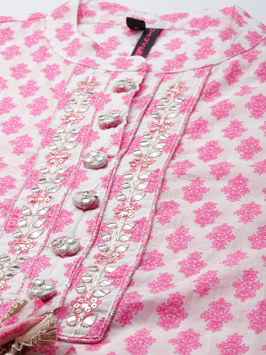 Pink Yoke Embellished A-Line Kurta With Trouser & Dupatta Set, Has Three-Quarter Sleeves, Mandarin Collar, Calf Length, Straight Hem & Side Slits.