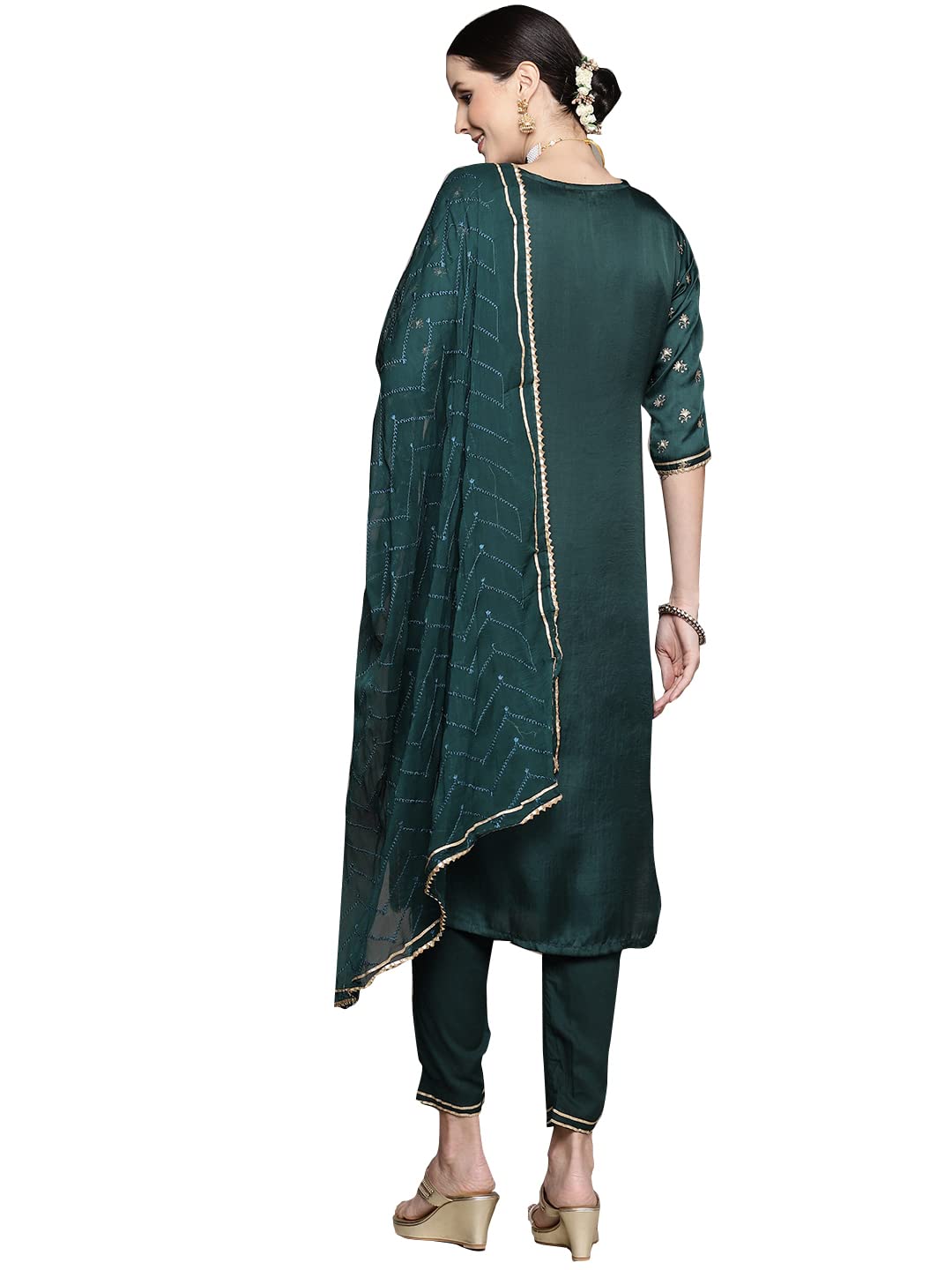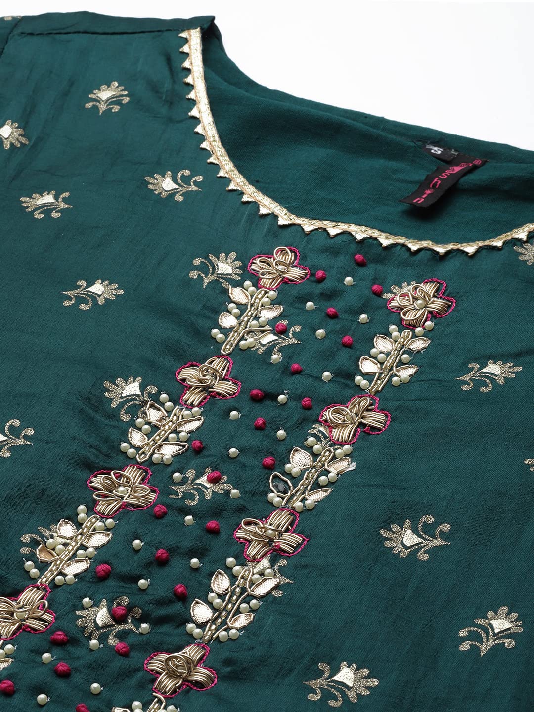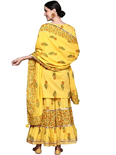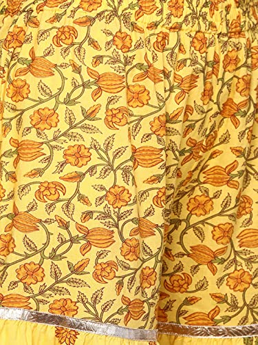 Mustard Printed Pleated Top with Trouser Set, Has Three-Quarter Sleeves, V Neck, Short Length, Flared Hem & No Slits.