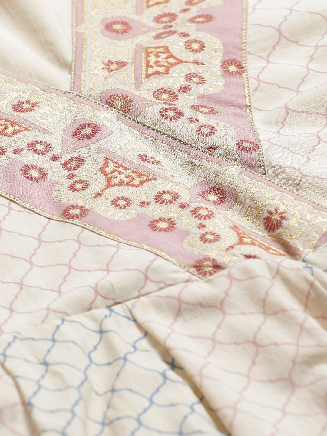 Beige foil printed anarkali kurta, has v neck, three-quarter sleeves, flared hem, has no slits.