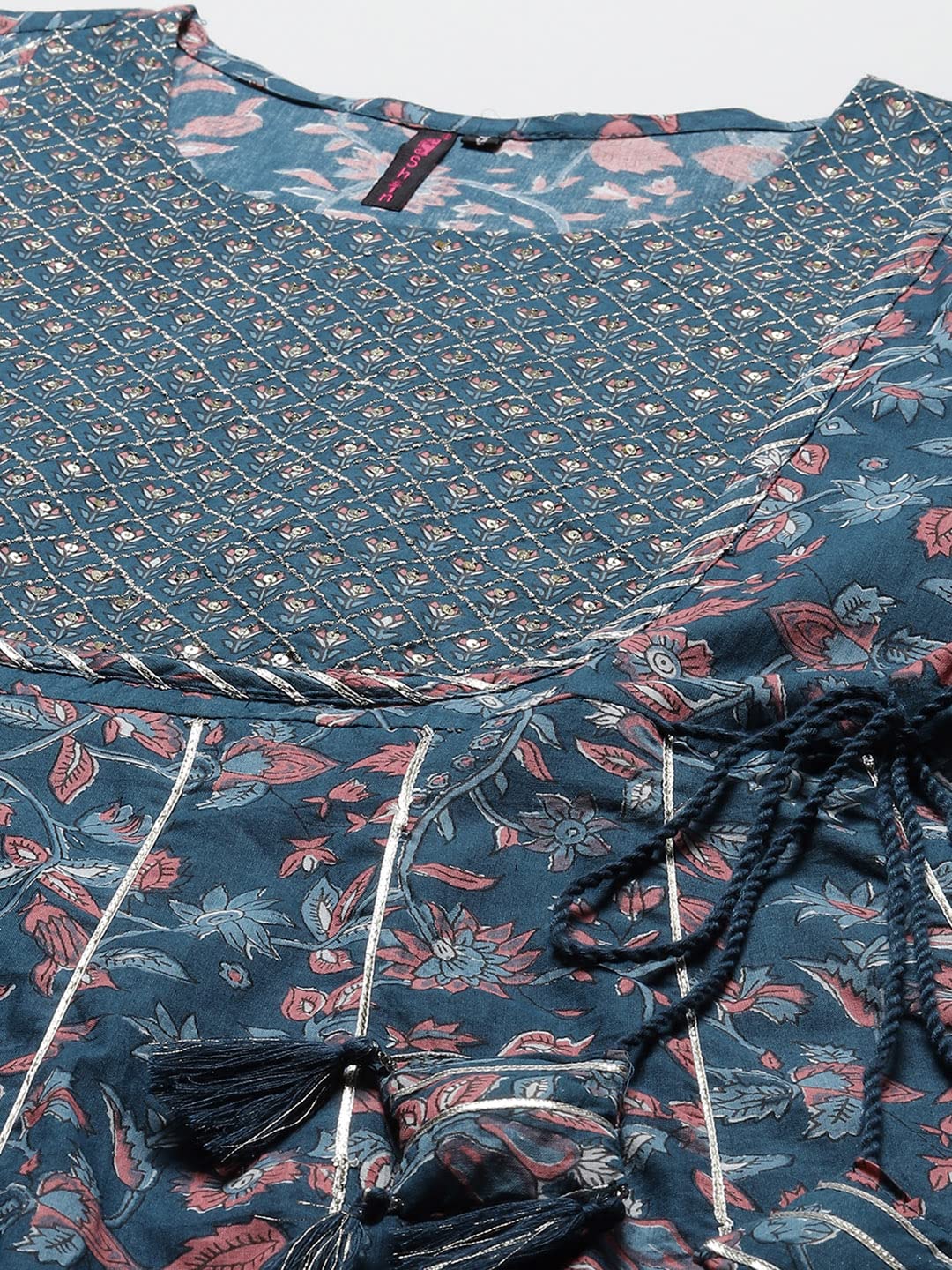 ishin Women's Cotton Blend Anarkali Embroidered Zari Floral print Teal Kurta suit set with Trouser