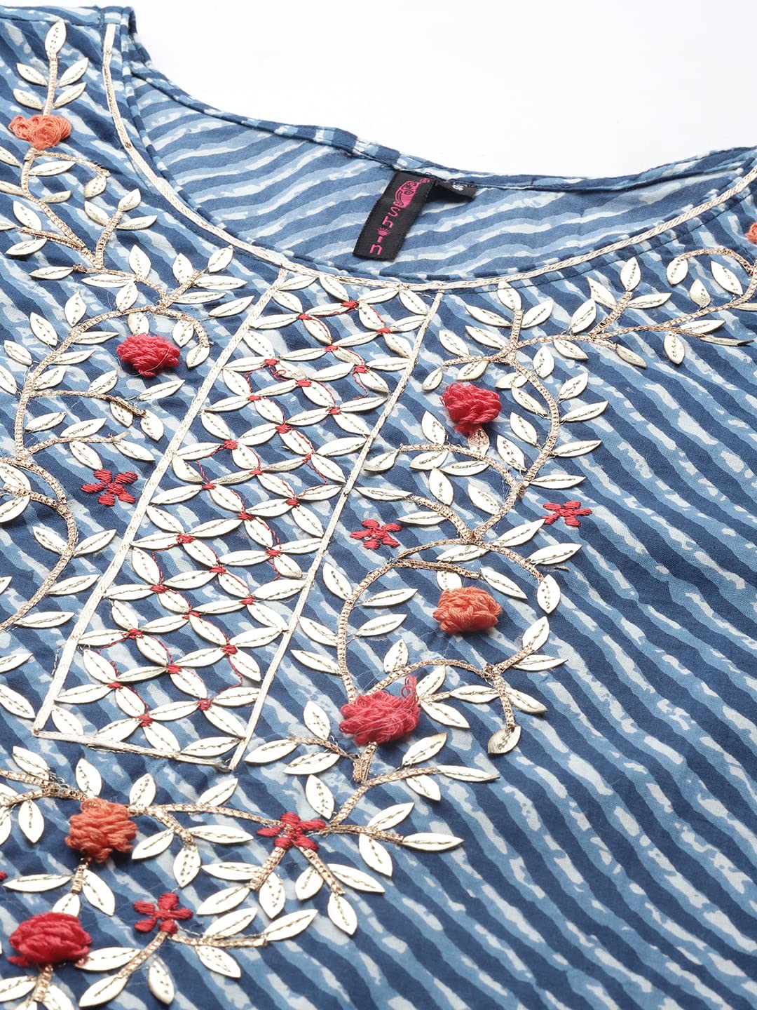 ishin Women's Cotton Blue Embroidered A-Line Kurta set with Trouser & Dupatta