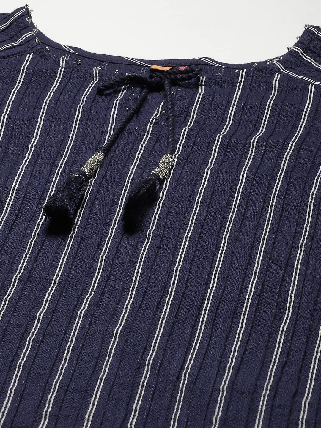 ishin Women's Cotton Pathani Embellished Beads and Stones Striped Print Navy Blue Kurti