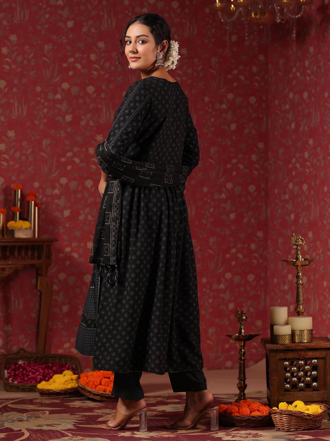 ishin Women's Ethnic Motifs Mirror Work Black Flared Kurta Suit Set with Trousers and Dupatta
