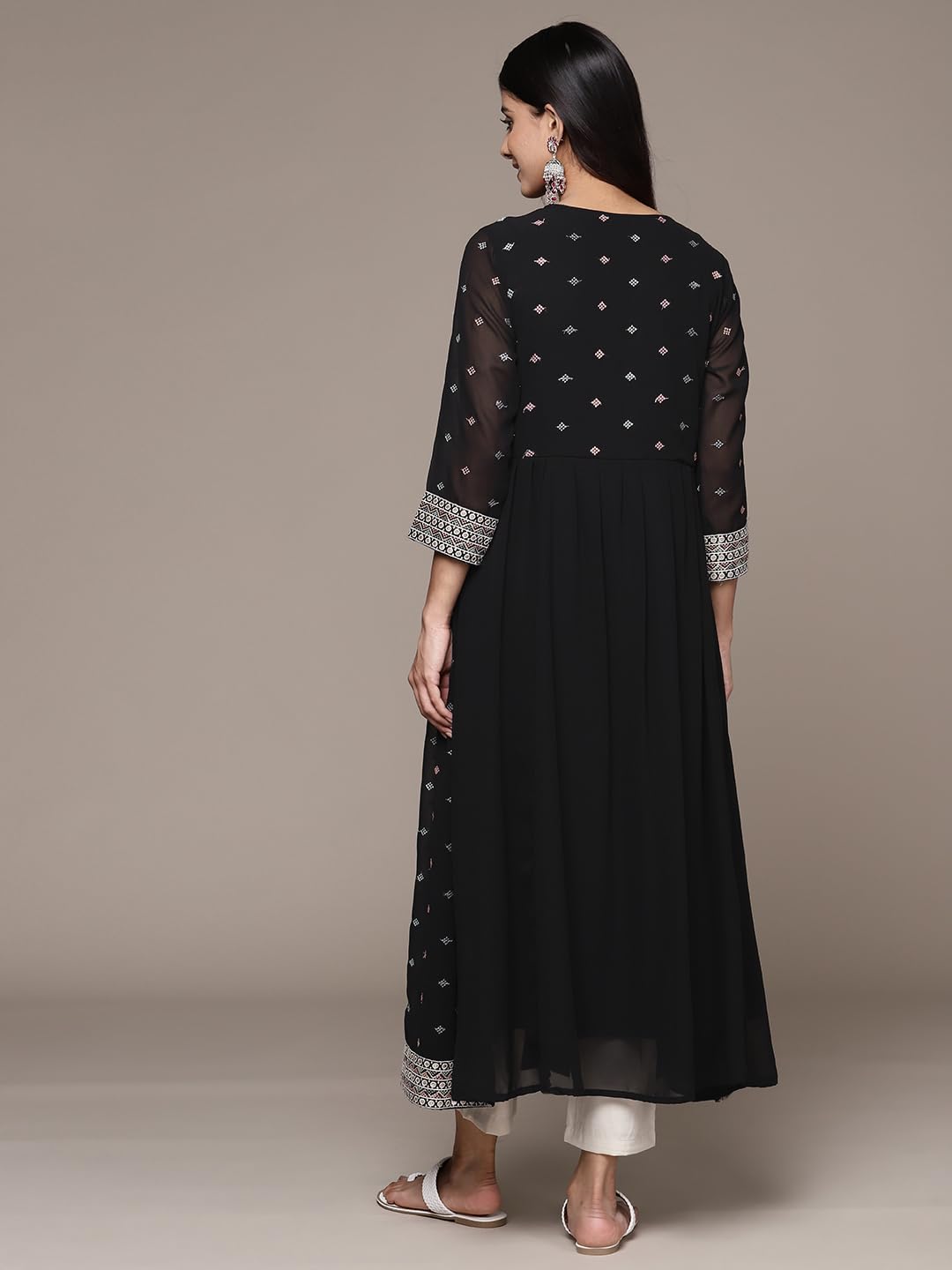 Ishin Women's Georgette Ethnic Motifs Black Anarkali Kurta- Color- Black, Shape- Anarkali, Length- Calf Length, HasRound Neck, Three-Quarter Sleeves, Ethnic Motifs