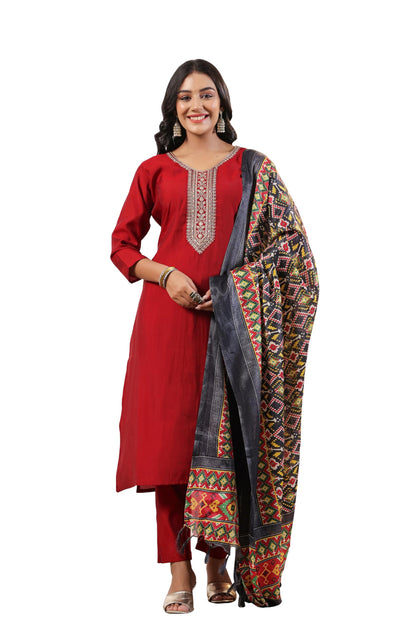 ishin Women's Maroon Ethnic Motifs Zari Work Staright Kurta with Trousers & Dupatta