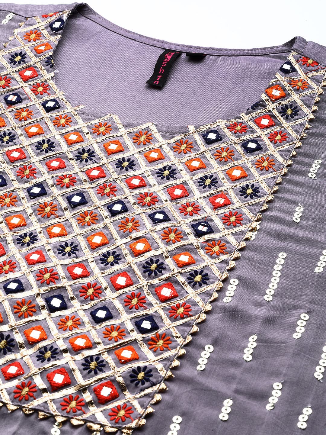 Mauve Embellished A-Line Kurta With Sharara & Dupatta Set, Has Three-Quarter Sleeves, Round Neck, Calf Length,Straight Hem &Side Slits.
