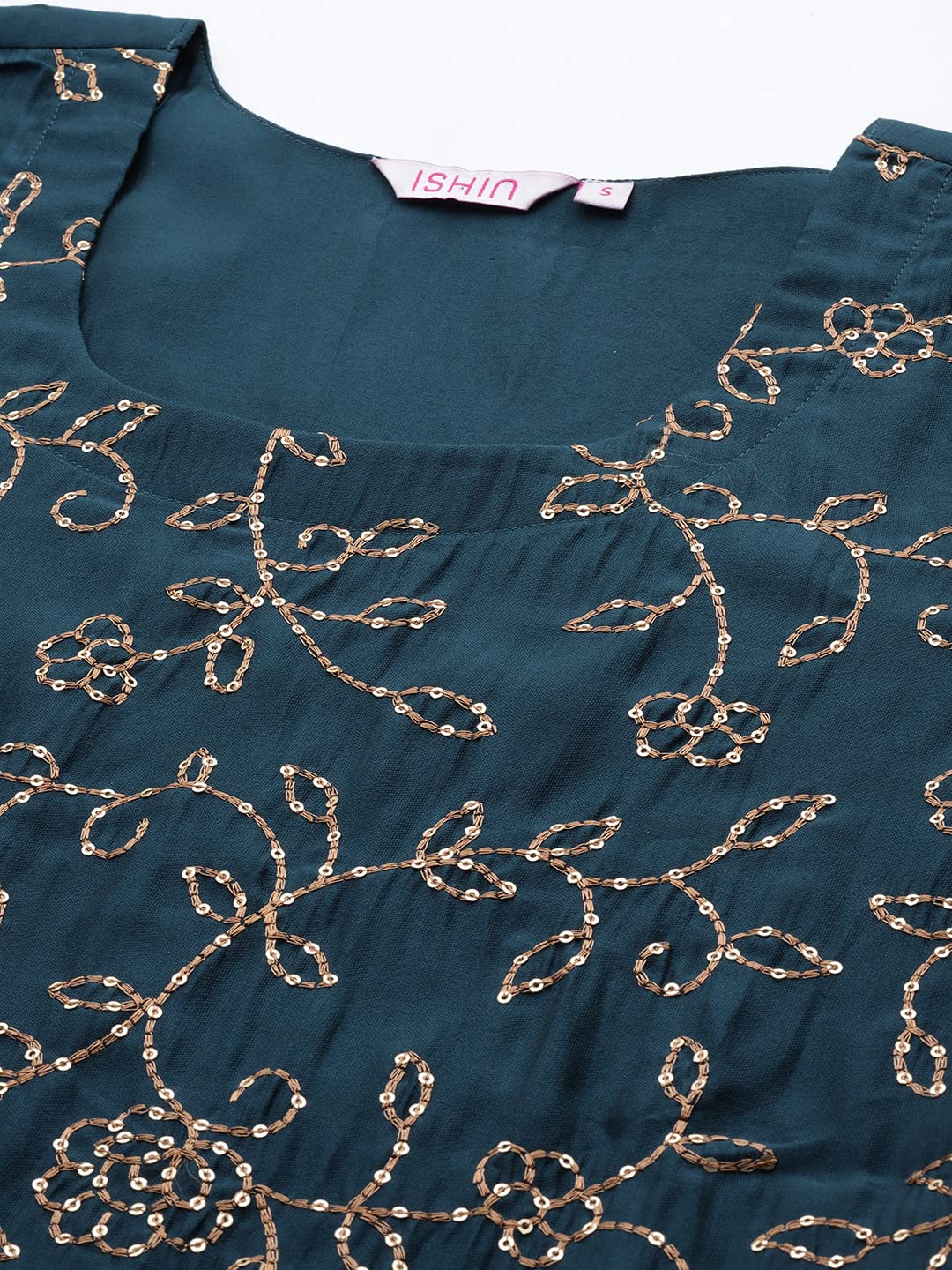Color-Teal,Pattern-Self Design,Silk Blend,Straight,Straight,Scoop Neck,Three-Quarter Sleeves