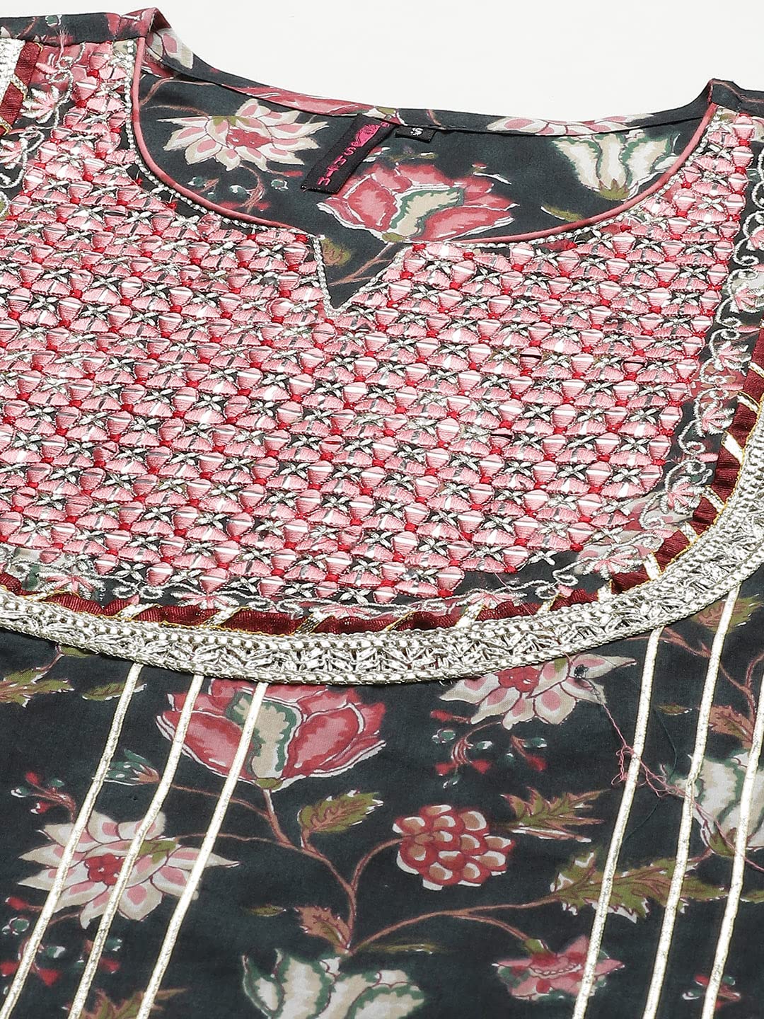 ishin Women's Pure Cotton Embroidered Gotta Patti Green Floral Print A-Line Kurta suit set With Dupatta & Sharara