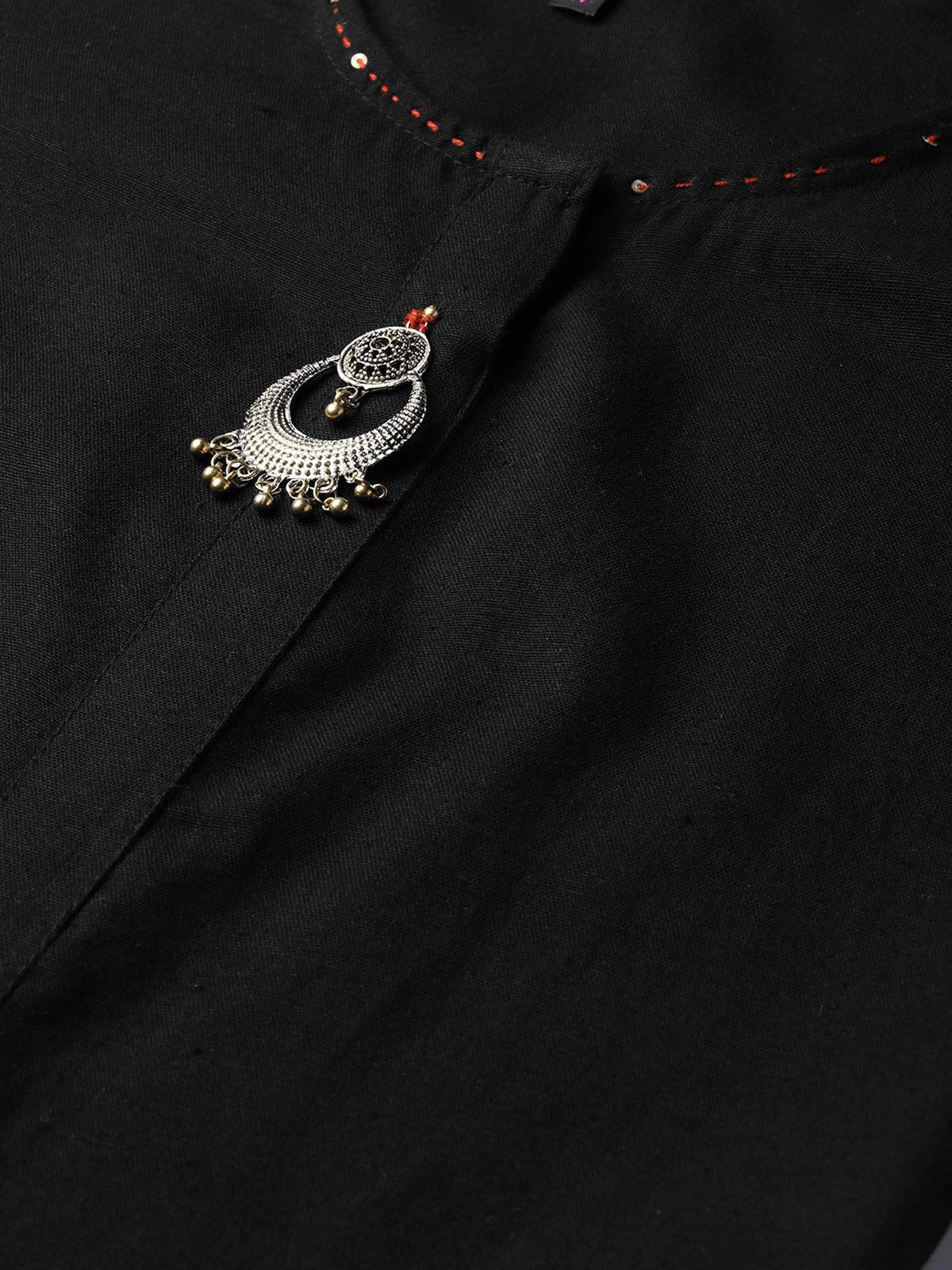 ishin Women's Pure Cotton Self Design Gotta Patti Black Floral Print A-Line Kurta suit set With Dupatta & Palazzo