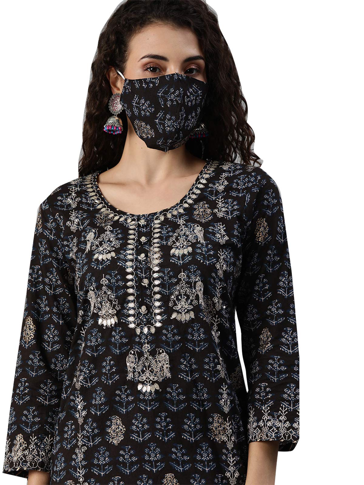 ishin Women's Pure Cotton Straight Printed Gotta Patti Striped print Black Kurta suit set with Palazzo