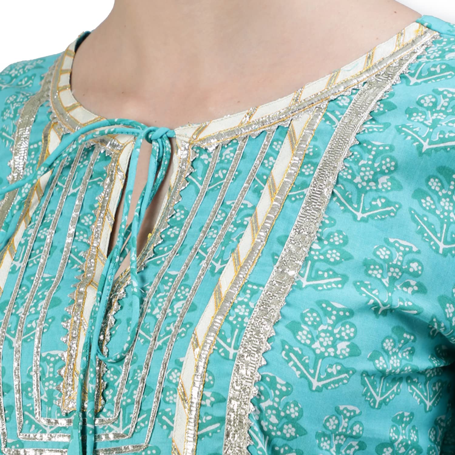 Sea Green Yoke Embroidered Anarkali Kurta With Trouser & Dupatta, Kurta Has Three-Quarter Sleeve and Tie-Up Neck, Striped Printed Trouser & Gota Patti Embroidered Dupatta