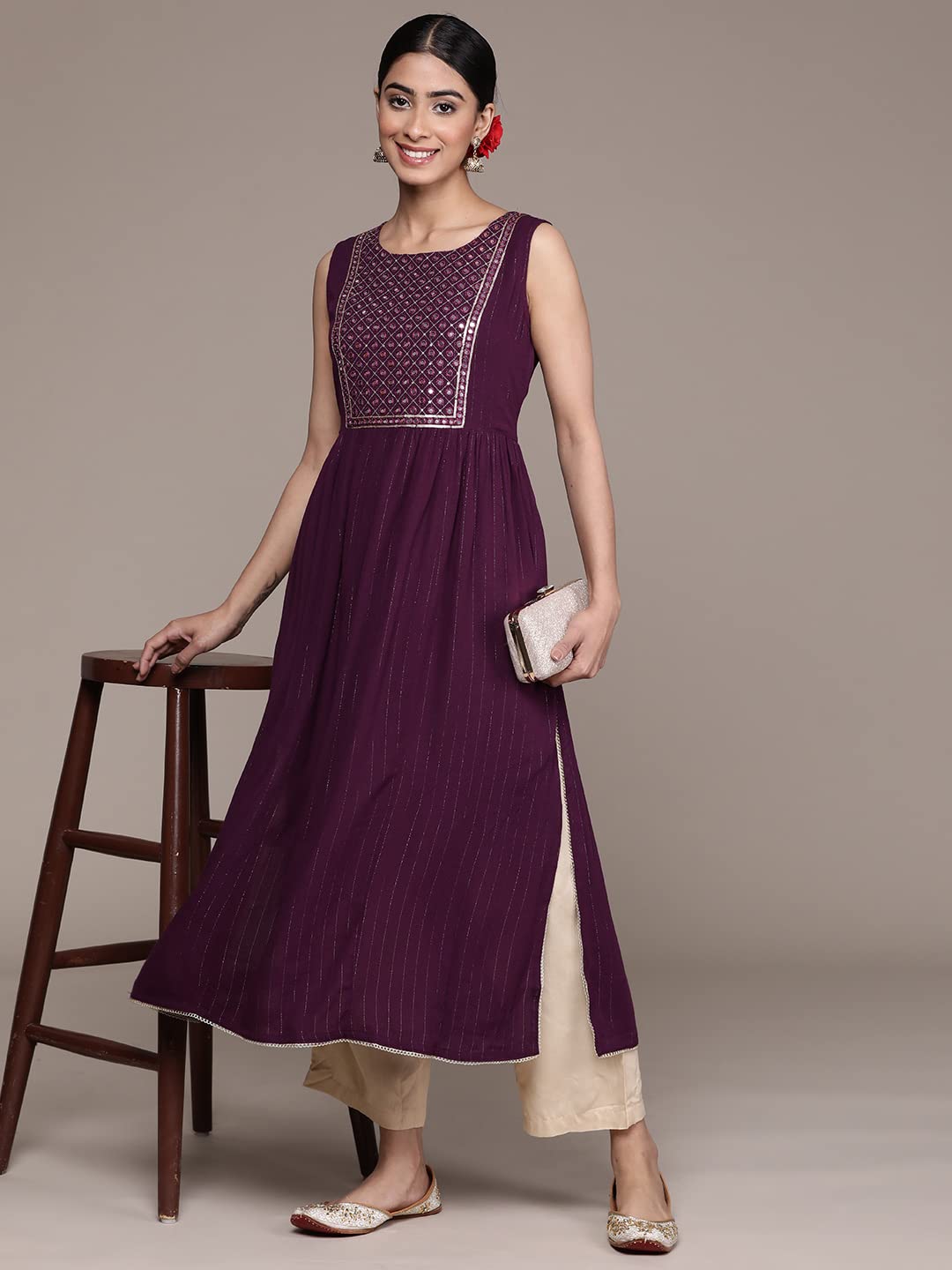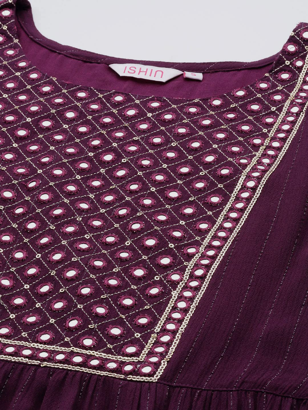 Color-Purple ,Pattern-Embellished,Round Neck,Three-Quarter Sleeves,A-Line,Calf Length