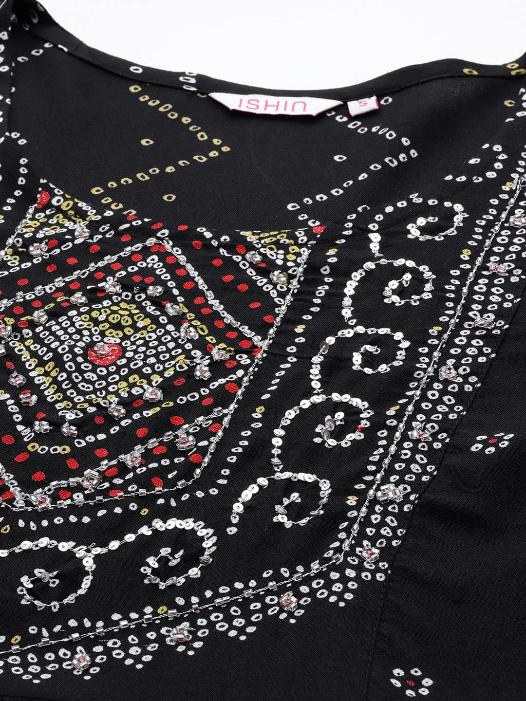 Color-Black ,Pattern-Ethnic Motifs,Round Neck,Three-Quarter Sleeves,A-Line,Calf Length