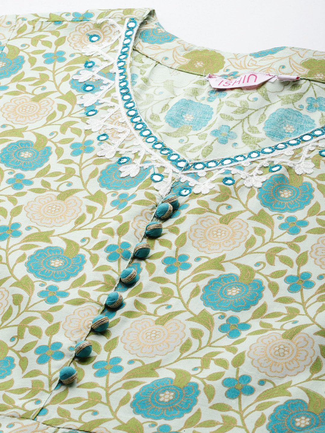 ishin Women's Viscose Rayon Floral Printed Green Anarkali Kurta Suit Set with Dupatta