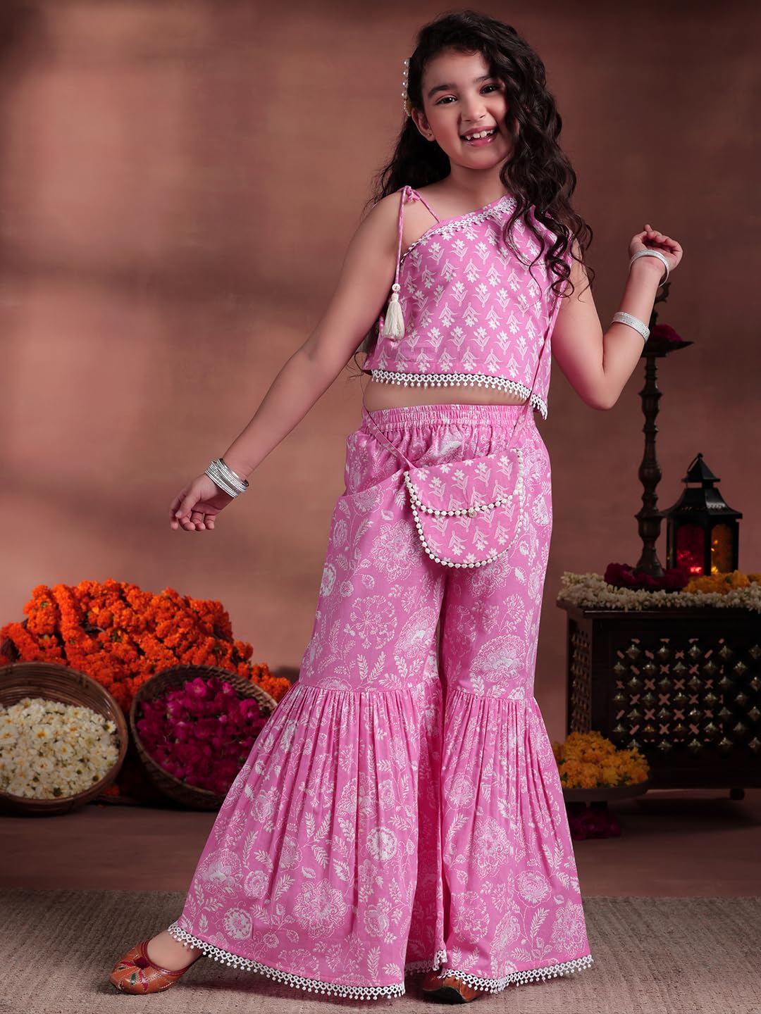 DescriptionPink Cotton Printed Top With Pink Cotton Printed Sharara With Pink Hand Bag