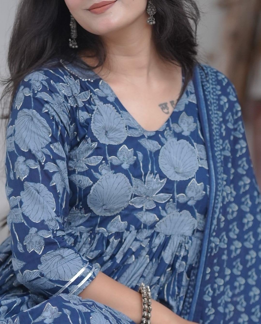 Nermosa Women'S Cotton Blend Printed Flared Anarkali Kurta With Pant And Dupatta Suit Set | Kurta Set | Wedding Suit | Festive Suit | (In, Alpha, Small, Blue)