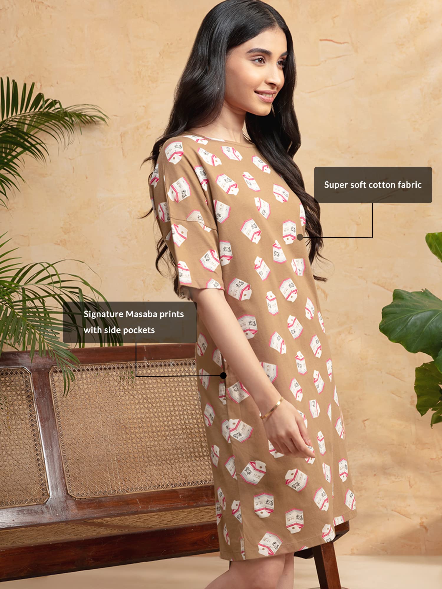 Nykd Women'S Cotton Printed Knee Length Night Dress Sleep Dress, Nys060, Milky Way Brown, S, 1N