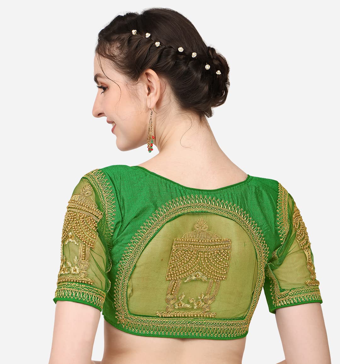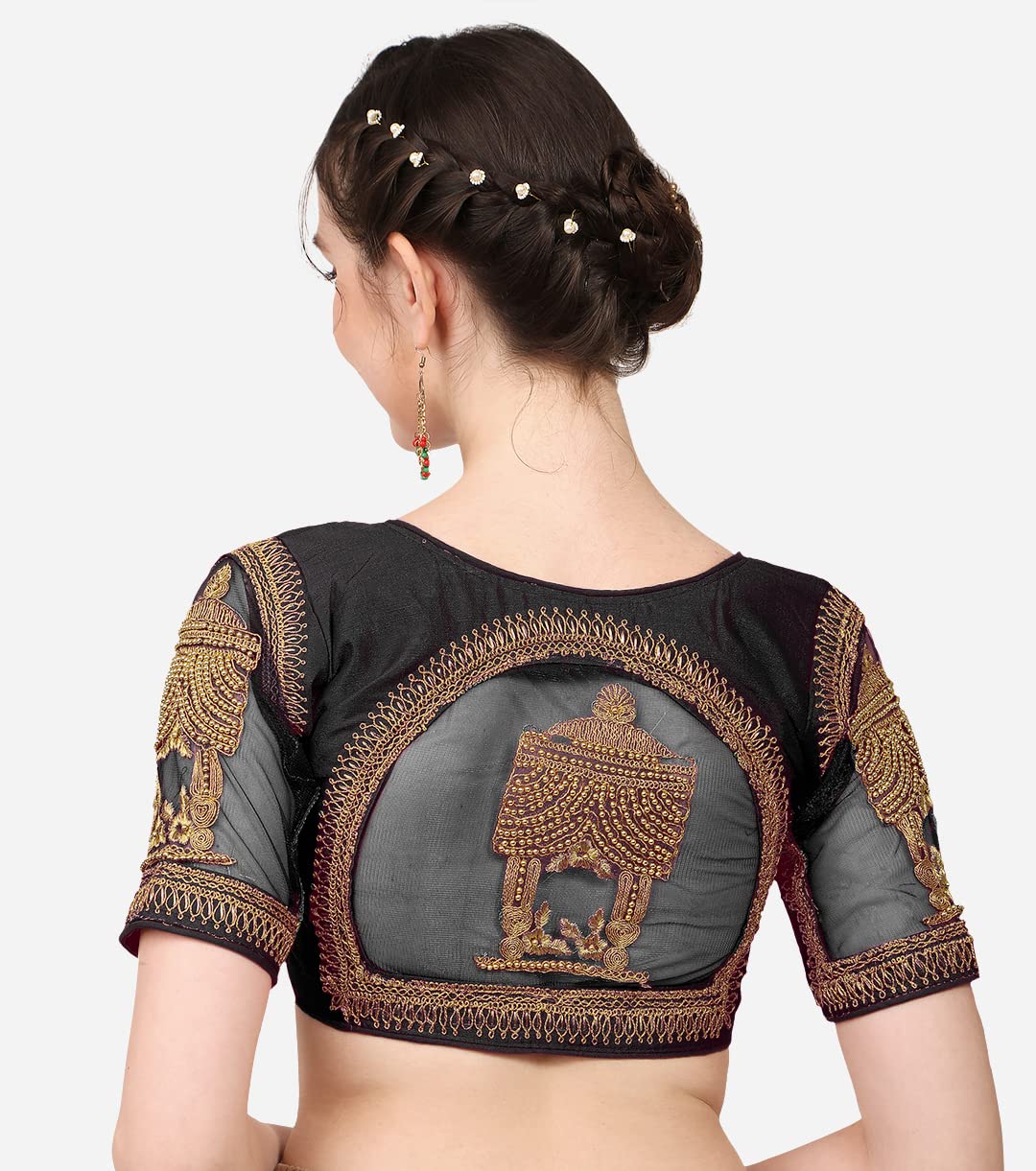 Pujia Mills WomenS Multicolor Temple Embroidery Net Back Sequence Khatli Work Sleeves Design Phantom Silk Readymade Saree Blouse (Temple Blouse_Black_38 Size+Margin)