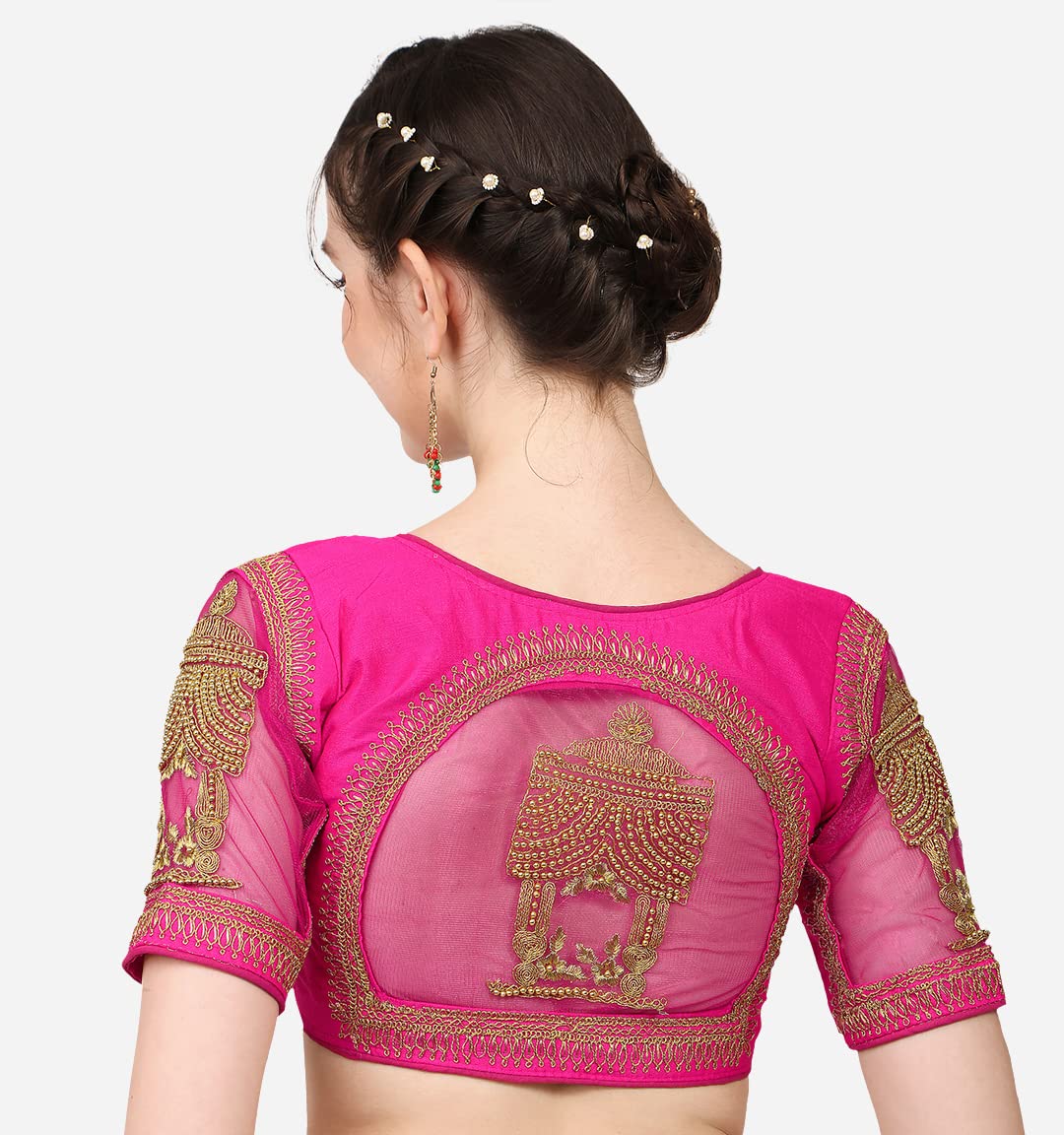 Pujia Mills WomenS Multicolor Temple Embroidery Net Back Sequence Khatli Work Sleeves Design Phantom Silk Readymade Saree Blous