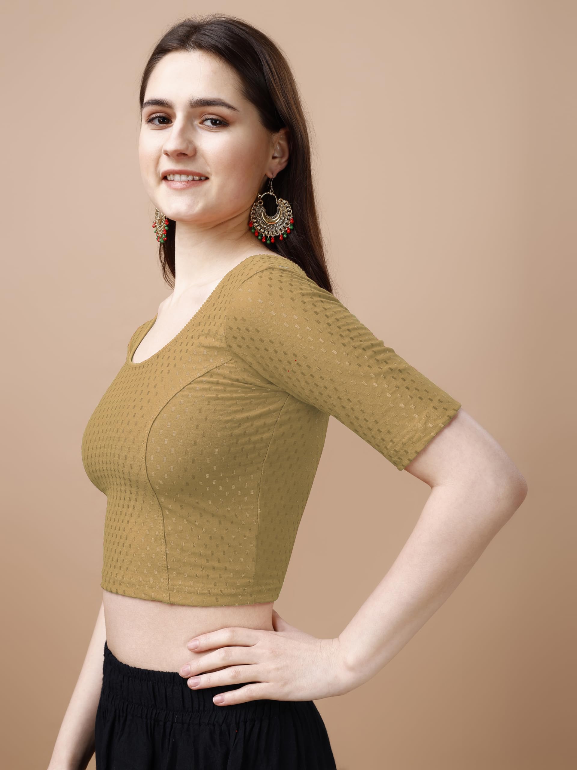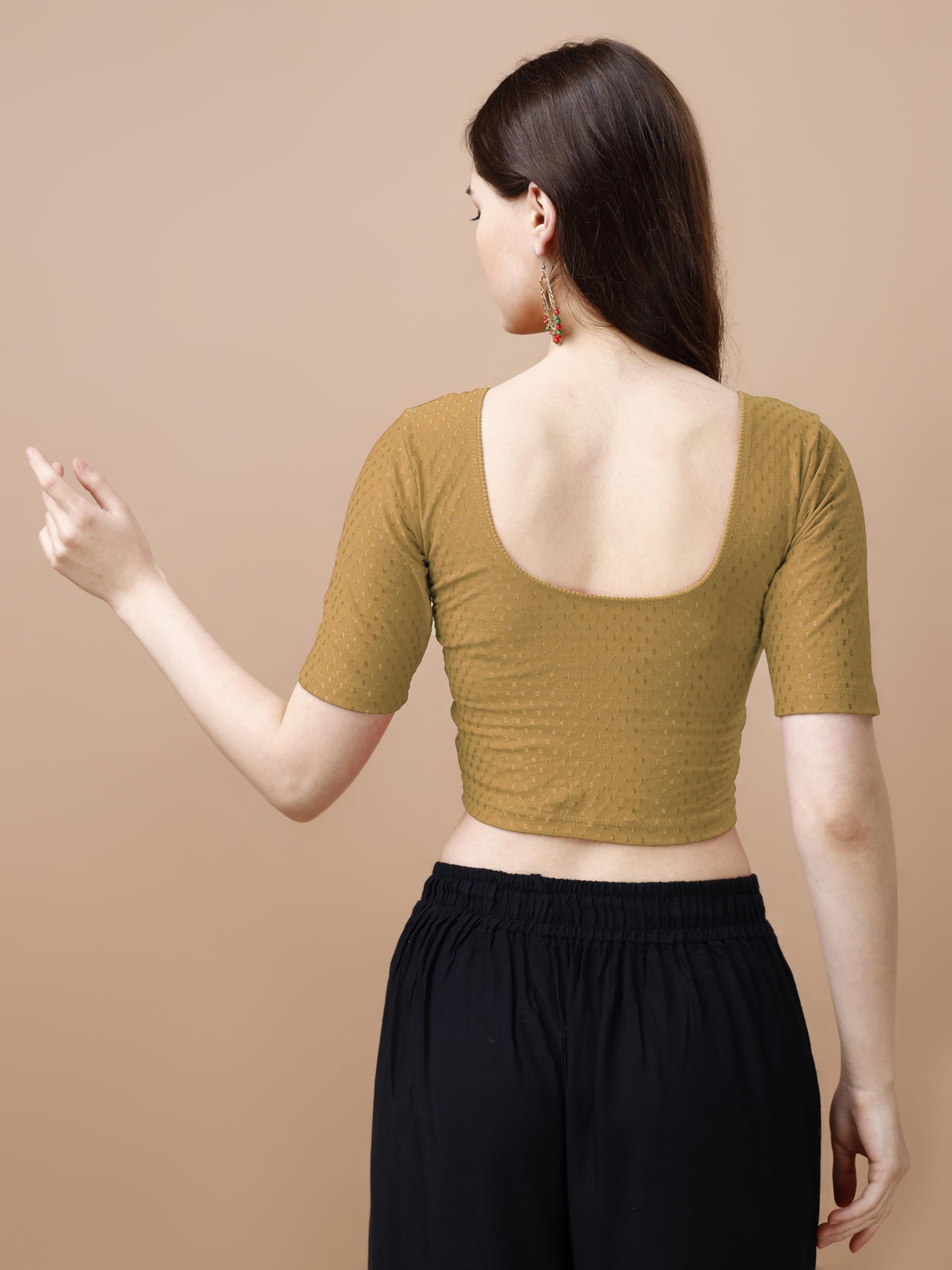 Pujia Mills WomenS Readymade Dobby Cotton Lycra Stretchable Round Neck Half Sleeve Blouse Fancy Gold Color Lycra Stretchable Blouse For Women Stylish Readymade Saree Blouse