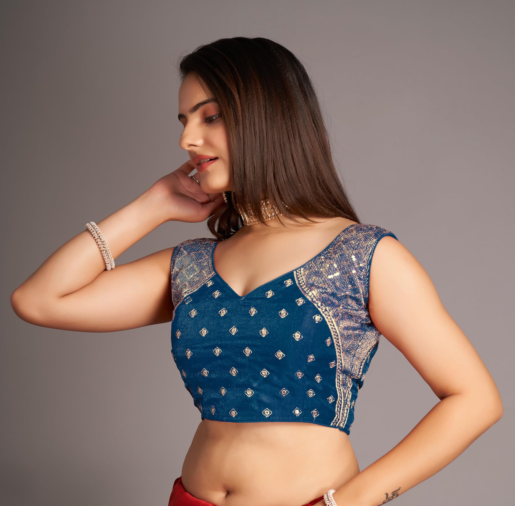 Pujia Mills WomenS Sequin Embroidered V Neck Sleeveless Morpeach Readymade Saree Blouse Indian Ethnic Stitched Padded Blouses For Women