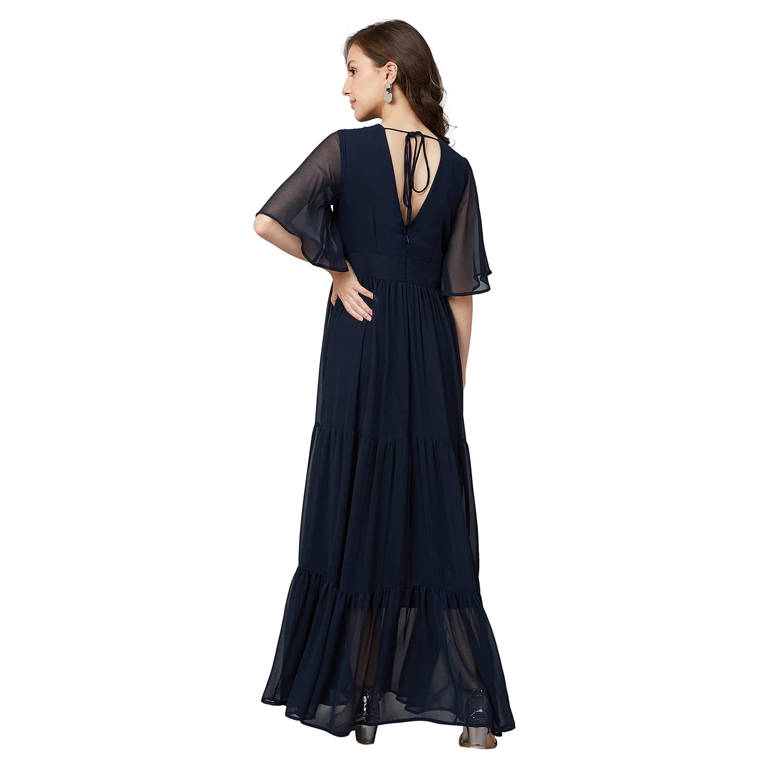 DescriptionWomen Casual Navy Blue Colour Fit And Flare V-Neck Maxi Short Sleeves Solid Dress